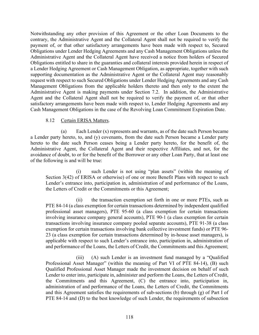 118 Notwithstanding any other provision of this Agreement or the other Loan Documents to the contrary, the Administrative Agent and the Collateral Agent shall not be required to verify the payment of, or that other satisfactory arrangements have been made with respect to, Secured Obligations under Lender Hedging Agreements and any Cash Management Obligations unless the Administrative Agent and the Collateral Agent have received a notice from holders of Secured Obligations entitled to share in the guaranties and collateral interests provided herein in respect of a Lender Hedging Agreement or Cash Management Obligation, as appropriate, together with such supporting documentation as the Administrative Agent or the Collateral Agent may reasonably request with respect to such Secured Obligations under Lender Hedging Agreements and any Cash Management Obligations from the applicable holders thereto and then only to the extent the Administrative Agent is making payments under Section 7.2. In addition, the Administrative Agent and the Collateral Agent shall not be required to verify the payment of, or that other satisfactory arrangements have been made with respect to, Lender Hedging Agreements and any Cash Management Obligations in the case of the Revolving Loan Commitment Expiration Date. 8.12 Certain ERISA Matters. (a) Each Lender (x) represents and warrants, as of the date such Person became a Lender party hereto, to, and (y) covenants, from the date such Person became a Lender party hereto to the date such Person ceases being a Lender party hereto, for the benefit of, the Administrative Agent, the Collateral Agent and their respective Affiliates, and not, for the avoidance of doubt, to or for the benefit of the Borrower or any other Loan Party, that at least one of the following is and will be true: (i) such Lender is not using “plan assets” (within the meaning of Section 3(42) of ERISA or otherwise) of one or more Benefit Plans with respect to such Lender’s entrance into, participation in, administration of and performance of the Loans, the Letters of Credit or the Commitments or this Agreement; (ii) the transaction exemption set forth in one or more PTEs, such as PTE 84-14 (a class exemption for certain transactions determined by independent qualified professional asset managers), PTE 95-60 (a class exemption for certain transactions involving insurance company general accounts), PTE 90-1 (a class exemption for certain transactions involving insurance company pooled separate accounts), PTE 91-38 (a class exemption for certain transactions involving bank collective investment funds) or PTE 96- 23 (a class exemption for certain transactions determined by in-house asset managers), is applicable with respect to such Lender’s entrance into, participation in, administration of and performance of the Loans, the Letters of Credit, the Commitments and this Agreement; (iii) (A) such Lender is an investment fund managed by a “Qualified Professional Asset Manager” (within the meaning of Part VI of PTE 84-14), (B) such Qualified Professional Asset Manager made the investment decision on behalf of such Lender to enter into, participate in, administer and perform the Loans, the Letters of Credit, the Commitments and this Agreement, (C) the entrance into, participation in, administration of and performance of the Loans, the Letters of Credit, the Commitments and this Agreement satisfies the requirements of sub-sections (b) through (g) of Part I of PTE 84-14 and (D) to the best knowledge of such Lender, the requirements of subsection