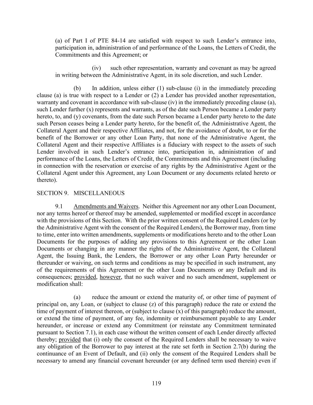 119 (a) of Part I of PTE 84-14 are satisfied with respect to such Lender’s entrance into, participation in, administration of and performance of the Loans, the Letters of Credit, the Commitments and this Agreement; or (iv) such other representation, warranty and covenant as may be agreed in writing between the Administrative Agent, in its sole discretion, and such Lender. (b) In addition, unless either (1) sub-clause (i) in the immediately preceding clause (a) is true with respect to a Lender or (2) a Lender has provided another representation, warranty and covenant in accordance with sub-clause (iv) in the immediately preceding clause (a), such Lender further (x) represents and warrants, as of the date such Person became a Lender party hereto, to, and (y) covenants, from the date such Person became a Lender party hereto to the date such Person ceases being a Lender party hereto, for the benefit of, the Administrative Agent, the Collateral Agent and their respective Affiliates, and not, for the avoidance of doubt, to or for the benefit of the Borrower or any other Loan Party, that none of the Administrative Agent, the Collateral Agent and their respective Affiliates is a fiduciary with respect to the assets of such Lender involved in such Lender’s entrance into, participation in, administration of and performance of the Loans, the Letters of Credit, the Commitments and this Agreement (including in connection with the reservation or exercise of any rights by the Administrative Agent or the Collateral Agent under this Agreement, any Loan Document or any documents related hereto or thereto). SECTION 9. MISCELLANEOUS 9.1 Amendments and Waivers. Neither this Agreement nor any other Loan Document, nor any terms hereof or thereof may be amended, supplemented or modified except in accordance with the provisions of this Section. With the prior written consent of the Required Lenders (or by the Administrative Agent with the consent of the Required Lenders), the Borrower may, from time to time, enter into written amendments, supplements or modifications hereto and to the other Loan Documents for the purposes of adding any provisions to this Agreement or the other Loan Documents or changing in any manner the rights of the Administrative Agent, the Collateral Agent, the Issuing Bank, the Lenders, the Borrower or any other Loan Party hereunder or thereunder or waiving, on such terms and conditions as may be specified in such instrument, any of the requirements of this Agreement or the other Loan Documents or any Default and its consequences; provided, however, that no such waiver and no such amendment, supplement or modification shall: (a) reduce the amount or extend the maturity of, or other time of payment of principal on, any Loan, or (subject to clause (z) of this paragraph) reduce the rate or extend the time of payment of interest thereon, or (subject to clause (x) of this paragraph) reduce the amount, or extend the time of payment, of any fee, indemnity or reimbursement payable to any Lender hereunder, or increase or extend any Commitment (or reinstate any Commitment terminated pursuant to Section 7.1), in each case without the written consent of each Lender directly affected thereby; provided that (i) only the consent of the Required Lenders shall be necessary to waive any obligation of the Borrower to pay interest at the rate set forth in Section 2.7(b) during the continuance of an Event of Default, and (ii) only the consent of the Required Lenders shall be necessary to amend any financial covenant hereunder (or any defined term used therein) even if