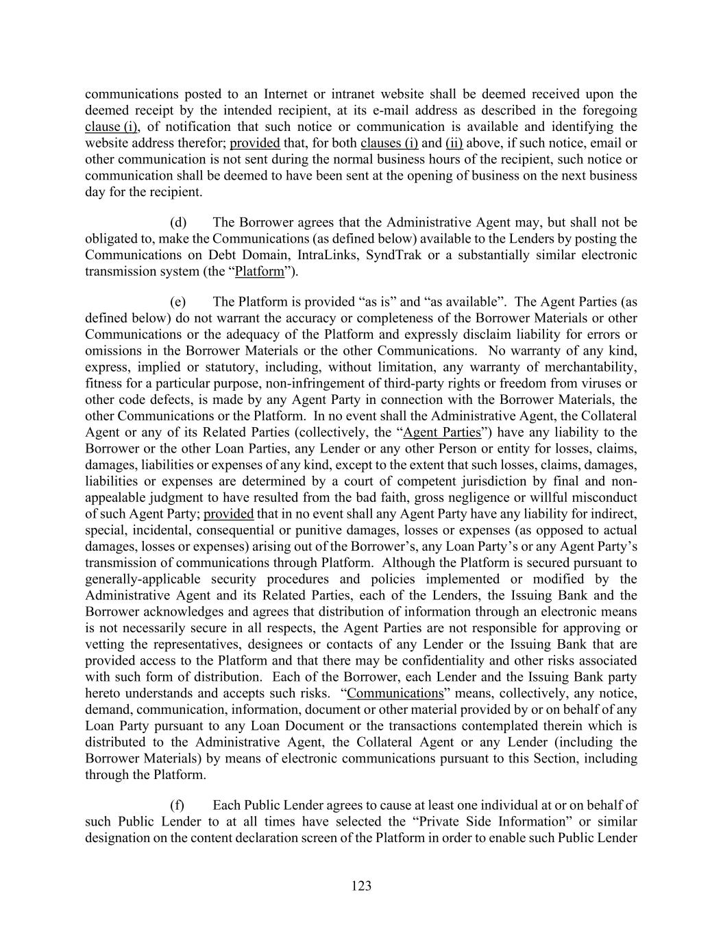 123 communications posted to an Internet or intranet website shall be deemed received upon the deemed receipt by the intended recipient, at its e-mail address as described in the foregoing clause (i), of notification that such notice or communication is available and identifying the website address therefor; provided that, for both clauses (i) and (ii) above, if such notice, email or other communication is not sent during the normal business hours of the recipient, such notice or communication shall be deemed to have been sent at the opening of business on the next business day for the recipient. (d) The Borrower agrees that the Administrative Agent may, but shall not be obligated to, make the Communications (as defined below) available to the Lenders by posting the Communications on Debt Domain, IntraLinks, SyndTrak or a substantially similar electronic transmission system (the “Platform”). (e) The Platform is provided “as is” and “as available”. The Agent Parties (as defined below) do not warrant the accuracy or completeness of the Borrower Materials or other Communications or the adequacy of the Platform and expressly disclaim liability for errors or omissions in the Borrower Materials or the other Communications. No warranty of any kind, express, implied or statutory, including, without limitation, any warranty of merchantability, fitness for a particular purpose, non-infringement of third-party rights or freedom from viruses or other code defects, is made by any Agent Party in connection with the Borrower Materials, the other Communications or the Platform. In no event shall the Administrative Agent, the Collateral Agent or any of its Related Parties (collectively, the “Agent Parties”) have any liability to the Borrower or the other Loan Parties, any Lender or any other Person or entity for losses, claims, damages, liabilities or expenses of any kind, except to the extent that such losses, claims, damages, liabilities or expenses are determined by a court of competent jurisdiction by final and non- appealable judgment to have resulted from the bad faith, gross negligence or willful misconduct of such Agent Party; provided that in no event shall any Agent Party have any liability for indirect, special, incidental, consequential or punitive damages, losses or expenses (as opposed to actual damages, losses or expenses) arising out of the Borrower’s, any Loan Party’s or any Agent Party’s transmission of communications through Platform. Although the Platform is secured pursuant to generally-applicable security procedures and policies implemented or modified by the Administrative Agent and its Related Parties, each of the Lenders, the Issuing Bank and the Borrower acknowledges and agrees that distribution of information through an electronic means is not necessarily secure in all respects, the Agent Parties are not responsible for approving or vetting the representatives, designees or contacts of any Lender or the Issuing Bank that are provided access to the Platform and that there may be confidentiality and other risks associated with such form of distribution. Each of the Borrower, each Lender and the Issuing Bank party hereto understands and accepts such risks. “Communications” means, collectively, any notice, demand, communication, information, document or other material provided by or on behalf of any Loan Party pursuant to any Loan Document or the transactions contemplated therein which is distributed to the Administrative Agent, the Collateral Agent or any Lender (including the Borrower Materials) by means of electronic communications pursuant to this Section, including through the Platform. (f) Each Public Lender agrees to cause at least one individual at or on behalf of such Public Lender to at all times have selected the “Private Side Information” or similar designation on the content declaration screen of the Platform in order to enable such Public Lender