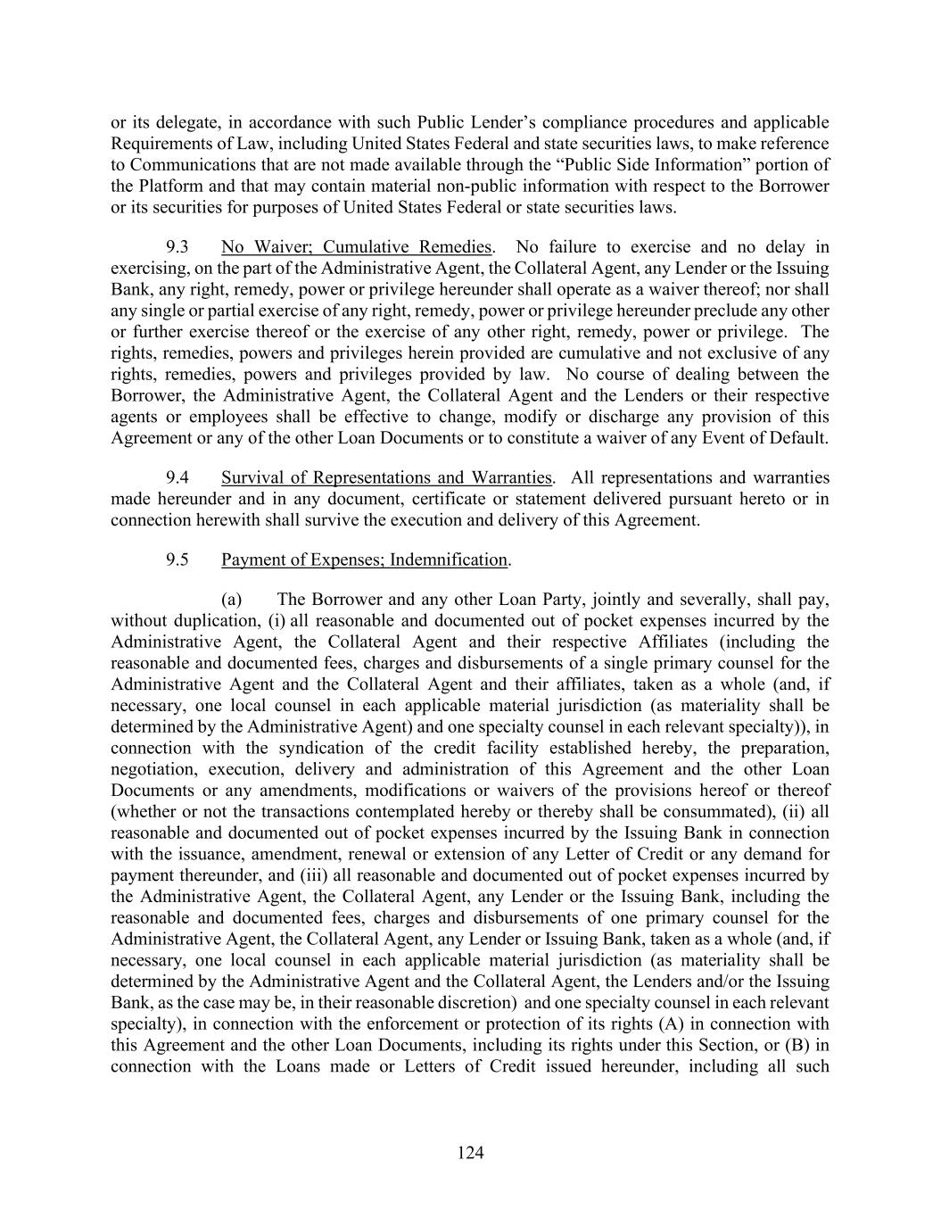 124 or its delegate, in accordance with such Public Lender’s compliance procedures and applicable Requirements of Law, including United States Federal and state securities laws, to make reference to Communications that are not made available through the “Public Side Information” portion of the Platform and that may contain material non-public information with respect to the Borrower or its securities for purposes of United States Federal or state securities laws. 9.3 No Waiver; Cumulative Remedies. No failure to exercise and no delay in exercising, on the part of the Administrative Agent, the Collateral Agent, any Lender or the Issuing Bank, any right, remedy, power or privilege hereunder shall operate as a waiver thereof; nor shall any single or partial exercise of any right, remedy, power or privilege hereunder preclude any other or further exercise thereof or the exercise of any other right, remedy, power or privilege. The rights, remedies, powers and privileges herein provided are cumulative and not exclusive of any rights, remedies, powers and privileges provided by law. No course of dealing between the Borrower, the Administrative Agent, the Collateral Agent and the Lenders or their respective agents or employees shall be effective to change, modify or discharge any provision of this Agreement or any of the other Loan Documents or to constitute a waiver of any Event of Default. 9.4 Survival of Representations and Warranties. All representations and warranties made hereunder and in any document, certificate or statement delivered pursuant hereto or in connection herewith shall survive the execution and delivery of this Agreement. 9.5 Payment of Expenses; Indemnification. (a) The Borrower and any other Loan Party, jointly and severally, shall pay, without duplication, (i) all reasonable and documented out of pocket expenses incurred by the Administrative Agent, the Collateral Agent and their respective Affiliates (including the reasonable and documented fees, charges and disbursements of a single primary counsel for the Administrative Agent and the Collateral Agent and their affiliates, taken as a whole (and, if necessary, one local counsel in each applicable material jurisdiction (as materiality shall be determined by the Administrative Agent) and one specialty counsel in each relevant specialty)), in connection with the syndication of the credit facility established hereby, the preparation, negotiation, execution, delivery and administration of this Agreement and the other Loan Documents or any amendments, modifications or waivers of the provisions hereof or thereof (whether or not the transactions contemplated hereby or thereby shall be consummated), (ii) all reasonable and documented out of pocket expenses incurred by the Issuing Bank in connection with the issuance, amendment, renewal or extension of any Letter of Credit or any demand for payment thereunder, and (iii) all reasonable and documented out of pocket expenses incurred by the Administrative Agent, the Collateral Agent, any Lender or the Issuing Bank, including the reasonable and documented fees, charges and disbursements of one primary counsel for the Administrative Agent, the Collateral Agent, any Lender or Issuing Bank, taken as a whole (and, if necessary, one local counsel in each applicable material jurisdiction (as materiality shall be determined by the Administrative Agent and the Collateral Agent, the Lenders and/or the Issuing Bank, as the case may be, in their reasonable discretion) and one specialty counsel in each relevant specialty), in connection with the enforcement or protection of its rights (A) in connection with this Agreement and the other Loan Documents, including its rights under this Section, or (B) in connection with the Loans made or Letters of Credit issued hereunder, including all such