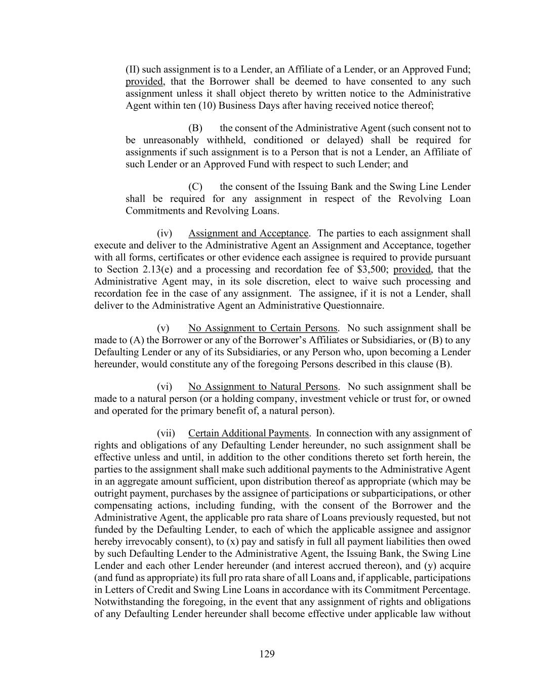 129 (II) such assignment is to a Lender, an Affiliate of a Lender, or an Approved Fund; provided, that the Borrower shall be deemed to have consented to any such assignment unless it shall object thereto by written notice to the Administrative Agent within ten (10) Business Days after having received notice thereof; (B) the consent of the Administrative Agent (such consent not to be unreasonably withheld, conditioned or delayed) shall be required for assignments if such assignment is to a Person that is not a Lender, an Affiliate of such Lender or an Approved Fund with respect to such Lender; and (C) the consent of the Issuing Bank and the Swing Line Lender shall be required for any assignment in respect of the Revolving Loan Commitments and Revolving Loans. (iv) Assignment and Acceptance. The parties to each assignment shall execute and deliver to the Administrative Agent an Assignment and Acceptance, together with all forms, certificates or other evidence each assignee is required to provide pursuant to Section 2.13(e) and a processing and recordation fee of $3,500; provided, that the Administrative Agent may, in its sole discretion, elect to waive such processing and recordation fee in the case of any assignment. The assignee, if it is not a Lender, shall deliver to the Administrative Agent an Administrative Questionnaire. (v) No Assignment to Certain Persons. No such assignment shall be made to (A) the Borrower or any of the Borrower’s Affiliates or Subsidiaries, or (B) to any Defaulting Lender or any of its Subsidiaries, or any Person who, upon becoming a Lender hereunder, would constitute any of the foregoing Persons described in this clause (B). (vi) No Assignment to Natural Persons. No such assignment shall be made to a natural person (or a holding company, investment vehicle or trust for, or owned and operated for the primary benefit of, a natural person). (vii) Certain Additional Payments. In connection with any assignment of rights and obligations of any Defaulting Lender hereunder, no such assignment shall be effective unless and until, in addition to the other conditions thereto set forth herein, the parties to the assignment shall make such additional payments to the Administrative Agent in an aggregate amount sufficient, upon distribution thereof as appropriate (which may be outright payment, purchases by the assignee of participations or subparticipations, or other compensating actions, including funding, with the consent of the Borrower and the Administrative Agent, the applicable pro rata share of Loans previously requested, but not funded by the Defaulting Lender, to each of which the applicable assignee and assignor hereby irrevocably consent), to (x) pay and satisfy in full all payment liabilities then owed by such Defaulting Lender to the Administrative Agent, the Issuing Bank, the Swing Line Lender and each other Lender hereunder (and interest accrued thereon), and (y) acquire (and fund as appropriate) its full pro rata share of all Loans and, if applicable, participations in Letters of Credit and Swing Line Loans in accordance with its Commitment Percentage. Notwithstanding the foregoing, in the event that any assignment of rights and obligations of any Defaulting Lender hereunder shall become effective under applicable law without