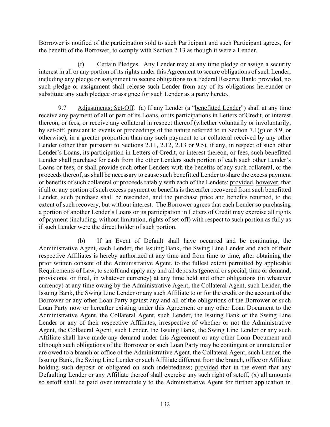 132 Borrower is notified of the participation sold to such Participant and such Participant agrees, for the benefit of the Borrower, to comply with Section 2.13 as though it were a Lender. (f) Certain Pledges. Any Lender may at any time pledge or assign a security interest in all or any portion of its rights under this Agreement to secure obligations of such Lender, including any pledge or assignment to secure obligations to a Federal Reserve Bank; provided, no such pledge or assignment shall release such Lender from any of its obligations hereunder or substitute any such pledgee or assignee for such Lender as a party hereto. 9.7 Adjustments; Set-Off. (a) If any Lender (a “benefitted Lender”) shall at any time receive any payment of all or part of its Loans, or its participations in Letters of Credit, or interest thereon, or fees, or receive any collateral in respect thereof (whether voluntarily or involuntarily, by set-off, pursuant to events or proceedings of the nature referred to in Section 7.1(g) or 8.9, or otherwise), in a greater proportion than any such payment to or collateral received by any other Lender (other than pursuant to Sections 2.11, 2.12, 2.13 or 9.5), if any, in respect of such other Lender’s Loans, its participation in Letters of Credit, or interest thereon, or fees, such benefitted Lender shall purchase for cash from the other Lenders such portion of each such other Lender’s Loans or fees, or shall provide such other Lenders with the benefits of any such collateral, or the proceeds thereof, as shall be necessary to cause such benefitted Lender to share the excess payment or benefits of such collateral or proceeds ratably with each of the Lenders; provided, however, that if all or any portion of such excess payment or benefits is thereafter recovered from such benefitted Lender, such purchase shall be rescinded, and the purchase price and benefits returned, to the extent of such recovery, but without interest. The Borrower agrees that each Lender so purchasing a portion of another Lender’s Loans or its participation in Letters of Credit may exercise all rights of payment (including, without limitation, rights of set-off) with respect to such portion as fully as if such Lender were the direct holder of such portion. (b) If an Event of Default shall have occurred and be continuing, the Administrative Agent, each Lender, the Issuing Bank, the Swing Line Lender and each of their respective Affiliates is hereby authorized at any time and from time to time, after obtaining the prior written consent of the Administrative Agent, to the fullest extent permitted by applicable Requirements of Law, to setoff and apply any and all deposits (general or special, time or demand, provisional or final, in whatever currency) at any time held and other obligations (in whatever currency) at any time owing by the Administrative Agent, the Collateral Agent, such Lender, the Issuing Bank, the Swing Line Lender or any such Affiliate to or for the credit or the account of the Borrower or any other Loan Party against any and all of the obligations of the Borrower or such Loan Party now or hereafter existing under this Agreement or any other Loan Document to the Administrative Agent, the Collateral Agent, such Lender, the Issuing Bank or the Swing Line Lender or any of their respective Affiliates, irrespective of whether or not the Administrative Agent, the Collateral Agent, such Lender, the Issuing Bank, the Swing Line Lender or any such Affiliate shall have made any demand under this Agreement or any other Loan Document and although such obligations of the Borrower or such Loan Party may be contingent or unmatured or are owed to a branch or office of the Administrative Agent, the Collateral Agent, such Lender, the Issuing Bank, the Swing Line Lender or such Affiliate different from the branch, office or Affiliate holding such deposit or obligated on such indebtedness; provided that in the event that any Defaulting Lender or any Affiliate thereof shall exercise any such right of setoff, (x) all amounts so setoff shall be paid over immediately to the Administrative Agent for further application in