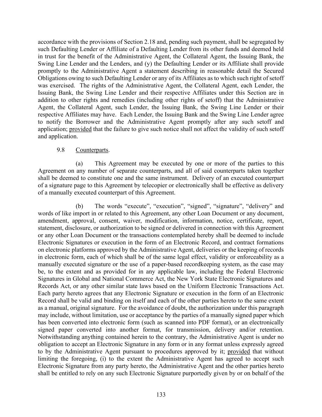 133 accordance with the provisions of Section 2.18 and, pending such payment, shall be segregated by such Defaulting Lender or Affiliate of a Defaulting Lender from its other funds and deemed held in trust for the benefit of the Administrative Agent, the Collateral Agent, the Issuing Bank, the Swing Line Lender and the Lenders, and (y) the Defaulting Lender or its Affiliate shall provide promptly to the Administrative Agent a statement describing in reasonable detail the Secured Obligations owing to such Defaulting Lender or any of its Affiliates as to which such right of setoff was exercised. The rights of the Administrative Agent, the Collateral Agent, each Lender, the Issuing Bank, the Swing Line Lender and their respective Affiliates under this Section are in addition to other rights and remedies (including other rights of setoff) that the Administrative Agent, the Collateral Agent, such Lender, the Issuing Bank, the Swing Line Lender or their respective Affiliates may have. Each Lender, the Issuing Bank and the Swing Line Lender agree to notify the Borrower and the Administrative Agent promptly after any such setoff and application; provided that the failure to give such notice shall not affect the validity of such setoff and application. 9.8 Counterparts. (a) This Agreement may be executed by one or more of the parties to this Agreement on any number of separate counterparts, and all of said counterparts taken together shall be deemed to constitute one and the same instrument. Delivery of an executed counterpart of a signature page to this Agreement by telecopier or electronically shall be effective as delivery of a manually executed counterpart of this Agreement. (b) The words “execute”, “execution”, “signed”, “signature”, “delivery” and words of like import in or related to this Agreement, any other Loan Document or any document, amendment, approval, consent, waiver, modification, information, notice, certificate, report, statement, disclosure, or authorization to be signed or delivered in connection with this Agreement or any other Loan Document or the transactions contemplated hereby shall be deemed to include Electronic Signatures or execution in the form of an Electronic Record, and contract formations on electronic platforms approved by the Administrative Agent, deliveries or the keeping of records in electronic form, each of which shall be of the same legal effect, validity or enforceability as a manually executed signature or the use of a paper-based recordkeeping system, as the case may be, to the extent and as provided for in any applicable law, including the Federal Electronic Signatures in Global and National Commerce Act, the New York State Electronic Signatures and Records Act, or any other similar state laws based on the Uniform Electronic Transactions Act. Each party hereto agrees that any Electronic Signature or execution in the form of an Electronic Record shall be valid and binding on itself and each of the other parties hereto to the same extent as a manual, original signature. For the avoidance of doubt, the authorization under this paragraph may include, without limitation, use or acceptance by the parties of a manually signed paper which has been converted into electronic form (such as scanned into PDF format), or an electronically signed paper converted into another format, for transmission, delivery and/or retention. Notwithstanding anything contained herein to the contrary, the Administrative Agent is under no obligation to accept an Electronic Signature in any form or in any format unless expressly agreed to by the Administrative Agent pursuant to procedures approved by it; provided that without limiting the foregoing, (i) to the extent the Administrative Agent has agreed to accept such Electronic Signature from any party hereto, the Administrative Agent and the other parties hereto shall be entitled to rely on any such Electronic Signature purportedly given by or on behalf of the