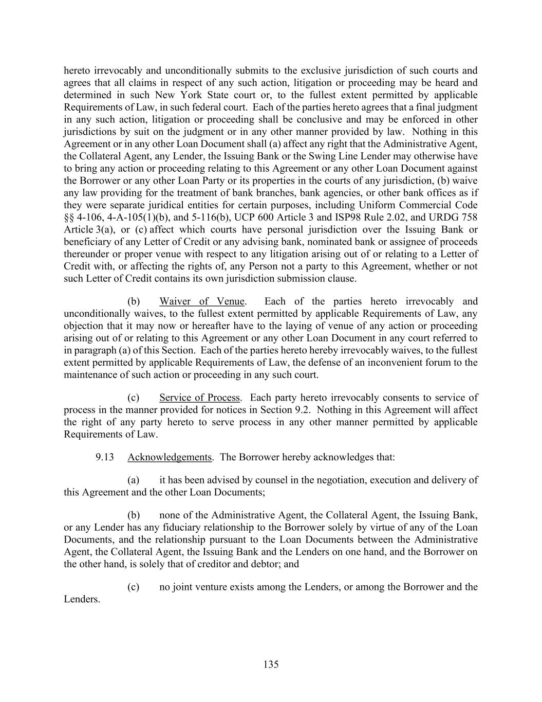 135 hereto irrevocably and unconditionally submits to the exclusive jurisdiction of such courts and agrees that all claims in respect of any such action, litigation or proceeding may be heard and determined in such New York State court or, to the fullest extent permitted by applicable Requirements of Law, in such federal court. Each of the parties hereto agrees that a final judgment in any such action, litigation or proceeding shall be conclusive and may be enforced in other jurisdictions by suit on the judgment or in any other manner provided by law. Nothing in this Agreement or in any other Loan Document shall (a) affect any right that the Administrative Agent, the Collateral Agent, any Lender, the Issuing Bank or the Swing Line Lender may otherwise have to bring any action or proceeding relating to this Agreement or any other Loan Document against the Borrower or any other Loan Party or its properties in the courts of any jurisdiction, (b) waive any law providing for the treatment of bank branches, bank agencies, or other bank offices as if they were separate juridical entities for certain purposes, including Uniform Commercial Code §§ 4-106, 4-A-105(1)(b), and 5-116(b), UCP 600 Article 3 and ISP98 Rule 2.02, and URDG 758 Article 3(a), or (c) affect which courts have personal jurisdiction over the Issuing Bank or beneficiary of any Letter of Credit or any advising bank, nominated bank or assignee of proceeds thereunder or proper venue with respect to any litigation arising out of or relating to a Letter of Credit with, or affecting the rights of, any Person not a party to this Agreement, whether or not such Letter of Credit contains its own jurisdiction submission clause. (b) Waiver of Venue. Each of the parties hereto irrevocably and unconditionally waives, to the fullest extent permitted by applicable Requirements of Law, any objection that it may now or hereafter have to the laying of venue of any action or proceeding arising out of or relating to this Agreement or any other Loan Document in any court referred to in paragraph (a) of this Section. Each of the parties hereto hereby irrevocably waives, to the fullest extent permitted by applicable Requirements of Law, the defense of an inconvenient forum to the maintenance of such action or proceeding in any such court. (c) Service of Process. Each party hereto irrevocably consents to service of process in the manner provided for notices in Section 9.2. Nothing in this Agreement will affect the right of any party hereto to serve process in any other manner permitted by applicable Requirements of Law. 9.13 Acknowledgements. The Borrower hereby acknowledges that: (a) it has been advised by counsel in the negotiation, execution and delivery of this Agreement and the other Loan Documents; (b) none of the Administrative Agent, the Collateral Agent, the Issuing Bank, or any Lender has any fiduciary relationship to the Borrower solely by virtue of any of the Loan Documents, and the relationship pursuant to the Loan Documents between the Administrative Agent, the Collateral Agent, the Issuing Bank and the Lenders on one hand, and the Borrower on the other hand, is solely that of creditor and debtor; and (c) no joint venture exists among the Lenders, or among the Borrower and the Lenders.