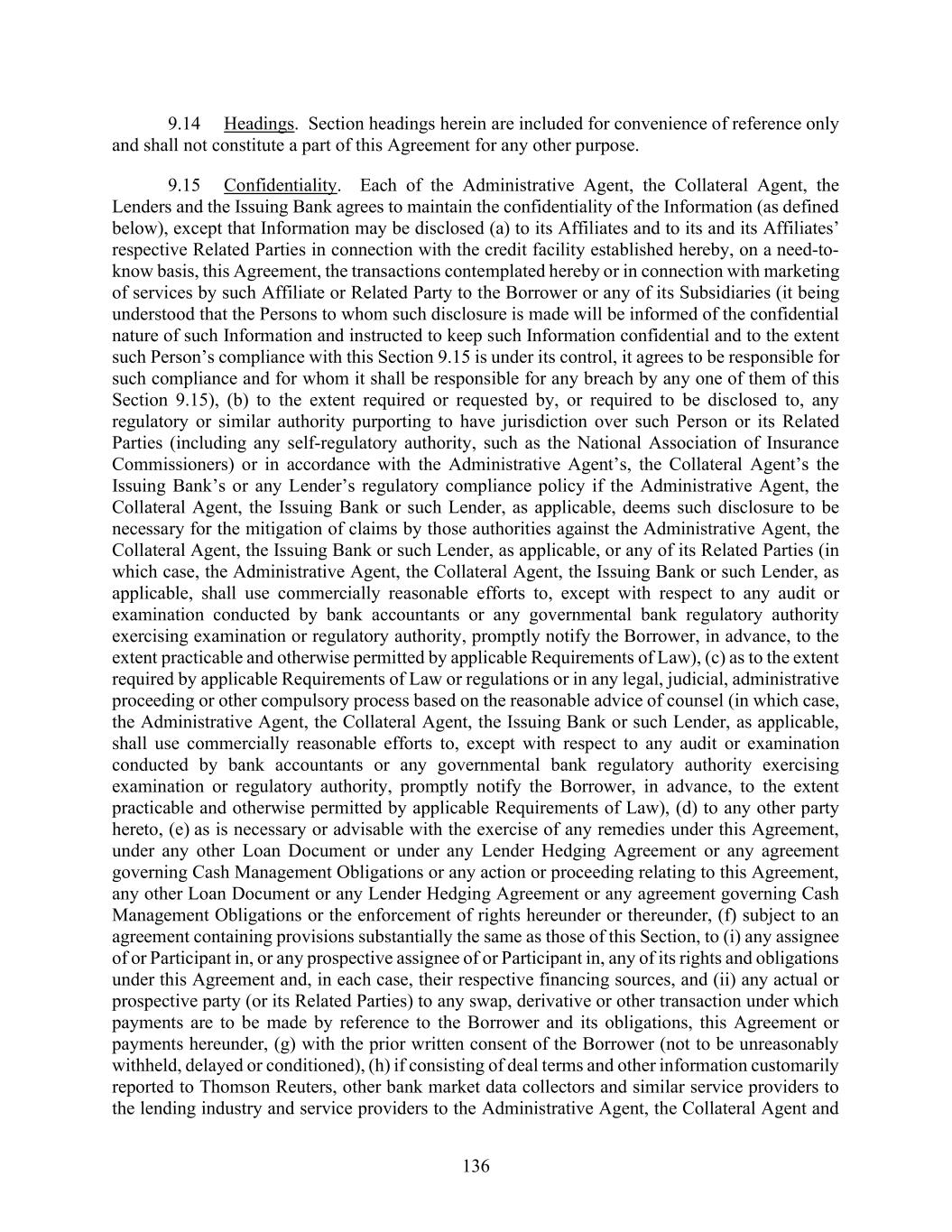 136 9.14 Headings. Section headings herein are included for convenience of reference only and shall not constitute a part of this Agreement for any other purpose. 9.15 Confidentiality. Each of the Administrative Agent, the Collateral Agent, the Lenders and the Issuing Bank agrees to maintain the confidentiality of the Information (as defined below), except that Information may be disclosed (a) to its Affiliates and to its and its Affiliates’ respective Related Parties in connection with the credit facility established hereby, on a need-to- know basis, this Agreement, the transactions contemplated hereby or in connection with marketing of services by such Affiliate or Related Party to the Borrower or any of its Subsidiaries (it being understood that the Persons to whom such disclosure is made will be informed of the confidential nature of such Information and instructed to keep such Information confidential and to the extent such Person’s compliance with this Section 9.15 is under its control, it agrees to be responsible for such compliance and for whom it shall be responsible for any breach by any one of them of this Section 9.15), (b) to the extent required or requested by, or required to be disclosed to, any regulatory or similar authority purporting to have jurisdiction over such Person or its Related Parties (including any self-regulatory authority, such as the National Association of Insurance Commissioners) or in accordance with the Administrative Agent’s, the Collateral Agent’s the Issuing Bank’s or any Lender’s regulatory compliance policy if the Administrative Agent, the Collateral Agent, the Issuing Bank or such Lender, as applicable, deems such disclosure to be necessary for the mitigation of claims by those authorities against the Administrative Agent, the Collateral Agent, the Issuing Bank or such Lender, as applicable, or any of its Related Parties (in which case, the Administrative Agent, the Collateral Agent, the Issuing Bank or such Lender, as applicable, shall use commercially reasonable efforts to, except with respect to any audit or examination conducted by bank accountants or any governmental bank regulatory authority exercising examination or regulatory authority, promptly notify the Borrower, in advance, to the extent practicable and otherwise permitted by applicable Requirements of Law), (c) as to the extent required by applicable Requirements of Law or regulations or in any legal, judicial, administrative proceeding or other compulsory process based on the reasonable advice of counsel (in which case, the Administrative Agent, the Collateral Agent, the Issuing Bank or such Lender, as applicable, shall use commercially reasonable efforts to, except with respect to any audit or examination conducted by bank accountants or any governmental bank regulatory authority exercising examination or regulatory authority, promptly notify the Borrower, in advance, to the extent practicable and otherwise permitted by applicable Requirements of Law), (d) to any other party hereto, (e) as is necessary or advisable with the exercise of any remedies under this Agreement, under any other Loan Document or under any Lender Hedging Agreement or any agreement governing Cash Management Obligations or any action or proceeding relating to this Agreement, any other Loan Document or any Lender Hedging Agreement or any agreement governing Cash Management Obligations or the enforcement of rights hereunder or thereunder, (f) subject to an agreement containing provisions substantially the same as those of this Section, to (i) any assignee of or Participant in, or any prospective assignee of or Participant in, any of its rights and obligations under this Agreement and, in each case, their respective financing sources, and (ii) any actual or prospective party (or its Related Parties) to any swap, derivative or other transaction under which payments are to be made by reference to the Borrower and its obligations, this Agreement or payments hereunder, (g) with the prior written consent of the Borrower (not to be unreasonably withheld, delayed or conditioned), (h) if consisting of deal terms and other information customarily reported to Thomson Reuters, other bank market data collectors and similar service providers to the lending industry and service providers to the Administrative Agent, the Collateral Agent and