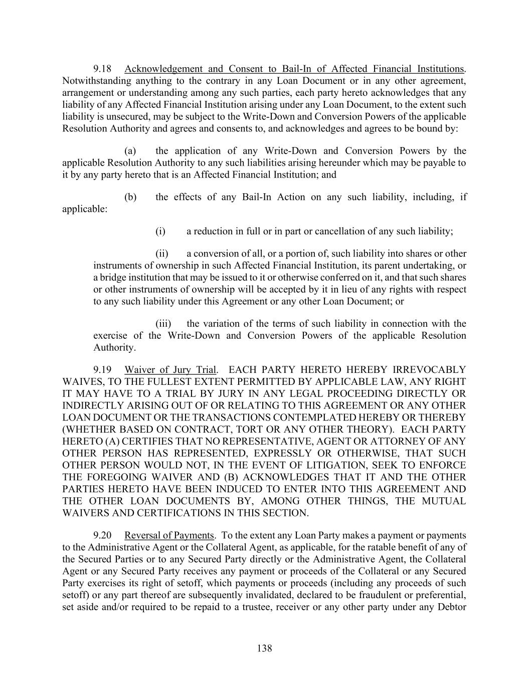138 9.18 Acknowledgement and Consent to Bail-In of Affected Financial Institutions. Notwithstanding anything to the contrary in any Loan Document or in any other agreement, arrangement or understanding among any such parties, each party hereto acknowledges that any liability of any Affected Financial Institution arising under any Loan Document, to the extent such liability is unsecured, may be subject to the Write-Down and Conversion Powers of the applicable Resolution Authority and agrees and consents to, and acknowledges and agrees to be bound by: (a) the application of any Write-Down and Conversion Powers by the applicable Resolution Authority to any such liabilities arising hereunder which may be payable to it by any party hereto that is an Affected Financial Institution; and (b) the effects of any Bail-In Action on any such liability, including, if applicable: (i) a reduction in full or in part or cancellation of any such liability; (ii) a conversion of all, or a portion of, such liability into shares or other instruments of ownership in such Affected Financial Institution, its parent undertaking, or a bridge institution that may be issued to it or otherwise conferred on it, and that such shares or other instruments of ownership will be accepted by it in lieu of any rights with respect to any such liability under this Agreement or any other Loan Document; or (iii) the variation of the terms of such liability in connection with the exercise of the Write-Down and Conversion Powers of the applicable Resolution Authority. 9.19 Waiver of Jury Trial. EACH PARTY HERETO HEREBY IRREVOCABLY WAIVES, TO THE FULLEST EXTENT PERMITTED BY APPLICABLE LAW, ANY RIGHT IT MAY HAVE TO A TRIAL BY JURY IN ANY LEGAL PROCEEDING DIRECTLY OR INDIRECTLY ARISING OUT OF OR RELATING TO THIS AGREEMENT OR ANY OTHER LOAN DOCUMENT OR THE TRANSACTIONS CONTEMPLATED HEREBY OR THEREBY (WHETHER BASED ON CONTRACT, TORT OR ANY OTHER THEORY). EACH PARTY HERETO (A) CERTIFIES THAT NO REPRESENTATIVE, AGENT OR ATTORNEY OF ANY OTHER PERSON HAS REPRESENTED, EXPRESSLY OR OTHERWISE, THAT SUCH OTHER PERSON WOULD NOT, IN THE EVENT OF LITIGATION, SEEK TO ENFORCE THE FOREGOING WAIVER AND (B) ACKNOWLEDGES THAT IT AND THE OTHER PARTIES HERETO HAVE BEEN INDUCED TO ENTER INTO THIS AGREEMENT AND THE OTHER LOAN DOCUMENTS BY, AMONG OTHER THINGS, THE MUTUAL WAIVERS AND CERTIFICATIONS IN THIS SECTION. 9.20 Reversal of Payments. To the extent any Loan Party makes a payment or payments to the Administrative Agent or the Collateral Agent, as applicable, for the ratable benefit of any of the Secured Parties or to any Secured Party directly or the Administrative Agent, the Collateral Agent or any Secured Party receives any payment or proceeds of the Collateral or any Secured Party exercises its right of setoff, which payments or proceeds (including any proceeds of such setoff) or any part thereof are subsequently invalidated, declared to be fraudulent or preferential, set aside and/or required to be repaid to a trustee, receiver or any other party under any Debtor