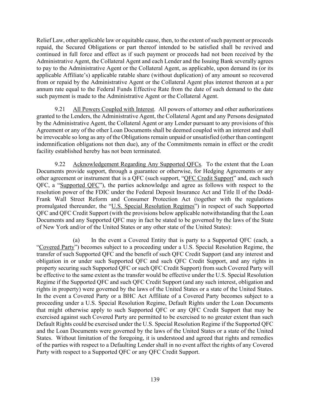 139 Relief Law, other applicable law or equitable cause, then, to the extent of such payment or proceeds repaid, the Secured Obligations or part thereof intended to be satisfied shall be revived and continued in full force and effect as if such payment or proceeds had not been received by the Administrative Agent, the Collateral Agent and each Lender and the Issuing Bank severally agrees to pay to the Administrative Agent or the Collateral Agent, as applicable, upon demand its (or its applicable Affiliate’s) applicable ratable share (without duplication) of any amount so recovered from or repaid by the Administrative Agent or the Collateral Agent plus interest thereon at a per annum rate equal to the Federal Funds Effective Rate from the date of such demand to the date such payment is made to the Administrative Agent or the Collateral Agent. 9.21 All Powers Coupled with Interest. All powers of attorney and other authorizations granted to the Lenders, the Administrative Agent, the Collateral Agent and any Persons designated by the Administrative Agent, the Collateral Agent or any Lender pursuant to any provisions of this Agreement or any of the other Loan Documents shall be deemed coupled with an interest and shall be irrevocable so long as any of the Obligations remain unpaid or unsatisfied (other than contingent indemnification obligations not then due), any of the Commitments remain in effect or the credit facility established hereby has not been terminated. 9.22 Acknowledgement Regarding Any Supported QFCs. To the extent that the Loan Documents provide support, through a guarantee or otherwise, for Hedging Agreements or any other agreement or instrument that is a QFC (such support, “QFC Credit Support” and, each such QFC, a “Supported QFC”), the parties acknowledge and agree as follows with respect to the resolution power of the FDIC under the Federal Deposit Insurance Act and Title II of the Dodd- Frank Wall Street Reform and Consumer Protection Act (together with the regulations promulgated thereunder, the “U.S. Special Resolution Regimes”) in respect of such Supported QFC and QFC Credit Support (with the provisions below applicable notwithstanding that the Loan Documents and any Supported QFC may in fact be stated to be governed by the laws of the State of New York and/or of the United States or any other state of the United States): (a) In the event a Covered Entity that is party to a Supported QFC (each, a “Covered Party”) becomes subject to a proceeding under a U.S. Special Resolution Regime, the transfer of such Supported QFC and the benefit of such QFC Credit Support (and any interest and obligation in or under such Supported QFC and such QFC Credit Support, and any rights in property securing such Supported QFC or such QFC Credit Support) from such Covered Party will be effective to the same extent as the transfer would be effective under the U.S. Special Resolution Regime if the Supported QFC and such QFC Credit Support (and any such interest, obligation and rights in property) were governed by the laws of the United States or a state of the United States. In the event a Covered Party or a BHC Act Affiliate of a Covered Party becomes subject to a proceeding under a U.S. Special Resolution Regime, Default Rights under the Loan Documents that might otherwise apply to such Supported QFC or any QFC Credit Support that may be exercised against such Covered Party are permitted to be exercised to no greater extent than such Default Rights could be exercised under the U.S. Special Resolution Regime if the Supported QFC and the Loan Documents were governed by the laws of the United States or a state of the United States. Without limitation of the foregoing, it is understood and agreed that rights and remedies of the parties with respect to a Defaulting Lender shall in no event affect the rights of any Covered Party with respect to a Supported QFC or any QFC Credit Support.