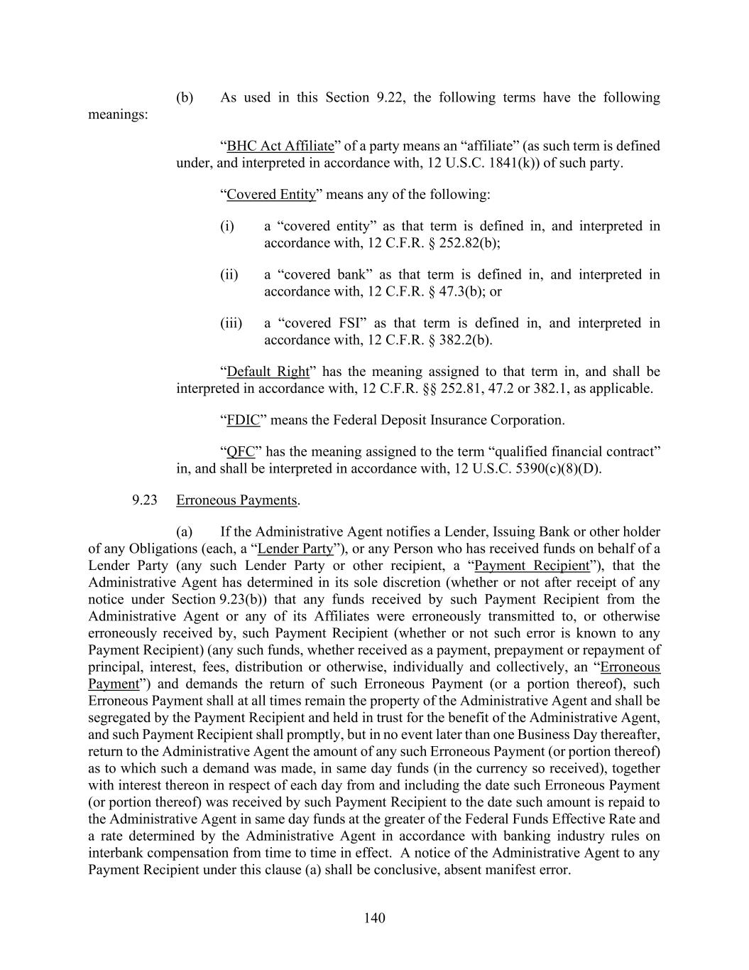 140 (b) As used in this Section 9.22, the following terms have the following meanings: “BHC Act Affiliate” of a party means an “affiliate” (as such term is defined under, and interpreted in accordance with, 12 U.S.C. 1841(k)) of such party. “Covered Entity” means any of the following: (i) a “covered entity” as that term is defined in, and interpreted in accordance with, 12 C.F.R. § 252.82(b); (ii) a “covered bank” as that term is defined in, and interpreted in accordance with, 12 C.F.R. § 47.3(b); or (iii) a “covered FSI” as that term is defined in, and interpreted in accordance with, 12 C.F.R. § 382.2(b). “Default Right” has the meaning assigned to that term in, and shall be interpreted in accordance with, 12 C.F.R. §§ 252.81, 47.2 or 382.1, as applicable. “FDIC” means the Federal Deposit Insurance Corporation. “QFC” has the meaning assigned to the term “qualified financial contract” in, and shall be interpreted in accordance with, 12 U.S.C. 5390(c)(8)(D). 9.23 Erroneous Payments. (a) If the Administrative Agent notifies a Lender, Issuing Bank or other holder of any Obligations (each, a “Lender Party”), or any Person who has received funds on behalf of a Lender Party (any such Lender Party or other recipient, a “Payment Recipient”), that the Administrative Agent has determined in its sole discretion (whether or not after receipt of any notice under Section 9.23(b)) that any funds received by such Payment Recipient from the Administrative Agent or any of its Affiliates were erroneously transmitted to, or otherwise erroneously received by, such Payment Recipient (whether or not such error is known to any Payment Recipient) (any such funds, whether received as a payment, prepayment or repayment of principal, interest, fees, distribution or otherwise, individually and collectively, an “Erroneous Payment”) and demands the return of such Erroneous Payment (or a portion thereof), such Erroneous Payment shall at all times remain the property of the Administrative Agent and shall be segregated by the Payment Recipient and held in trust for the benefit of the Administrative Agent, and such Payment Recipient shall promptly, but in no event later than one Business Day thereafter, return to the Administrative Agent the amount of any such Erroneous Payment (or portion thereof) as to which such a demand was made, in same day funds (in the currency so received), together with interest thereon in respect of each day from and including the date such Erroneous Payment (or portion thereof) was received by such Payment Recipient to the date such amount is repaid to the Administrative Agent in same day funds at the greater of the Federal Funds Effective Rate and a rate determined by the Administrative Agent in accordance with banking industry rules on interbank compensation from time to time in effect. A notice of the Administrative Agent to any Payment Recipient under this clause (a) shall be conclusive, absent manifest error.