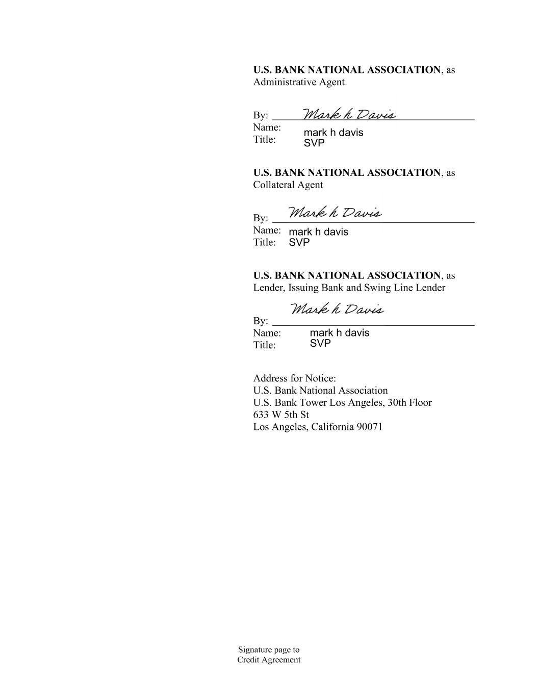 Signature page to Credit Agreement U.S. BANK NATIONAL ASSOCIATION, as Administrative Agent By: Name: Title: U.S. BANK NATIONAL ASSOCIATION, as Collateral Agent By: Name: Title: U.S. BANK NATIONAL ASSOCIATION, as Lender, Issuing Bank and Swing Line Lender By: Name: Title: Address for Notice: U.S. Bank National Association U.S. Bank Tower Los Angeles, 30th Floor 633 W 5th St Los Angeles, California 90071 mark h davis SVP mark h davis SVP mark h davis SVP