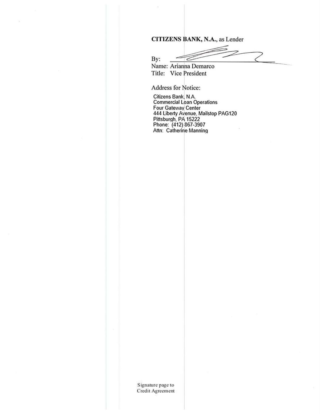 CITIZENS BANK, N.A., as Lender By: Name: Arianna Demarco Title: Vice President Address for Notice: Citizens Bank, N.A. Commercial Loan Operations Four Gateway Center 444 Liberty Avenue, Mailstop PAG120 Pittsburgh, PA 15222 Phone: (412) 867-3907 Attn: Catherine Manning Signature page to Credit Agreement