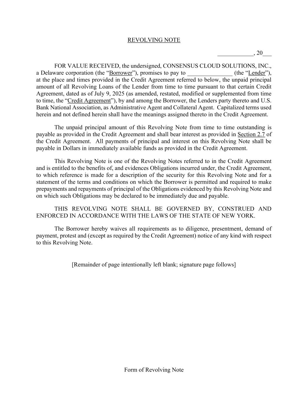 Form of Revolving Note REVOLVING NOTE ____________, 20___ FOR VALUE RECEIVED, the undersigned, CONSENSUS CLOUD SOLUTIONS, INC., a Delaware corporation (the “Borrower”), promises to pay to _______________ (the “Lender”), at the place and times provided in the Credit Agreement referred to below, the unpaid principal amount of all Revolving Loans of the Lender from time to time pursuant to that certain Credit Agreement, dated as of July 9, 2025 (as amended, restated, modified or supplemented from time to time, the “Credit Agreement”), by and among the Borrower, the Lenders party thereto and U.S. Bank National Association, as Administrative Agent and Collateral Agent. Capitalized terms used herein and not defined herein shall have the meanings assigned thereto in the Credit Agreement. The unpaid principal amount of this Revolving Note from time to time outstanding is payable as provided in the Credit Agreement and shall bear interest as provided in Section 2.7 of the Credit Agreement. All payments of principal and interest on this Revolving Note shall be payable in Dollars in immediately available funds as provided in the Credit Agreement. This Revolving Note is one of the Revolving Notes referred to in the Credit Agreement and is entitled to the benefits of, and evidences Obligations incurred under, the Credit Agreement, to which reference is made for a description of the security for this Revolving Note and for a statement of the terms and conditions on which the Borrower is permitted and required to make prepayments and repayments of principal of the Obligations evidenced by this Revolving Note and on which such Obligations may be declared to be immediately due and payable. THIS REVOLVING NOTE SHALL BE GOVERNED BY, CONSTRUED AND ENFORCED IN ACCORDANCE WITH THE LAWS OF THE STATE OF NEW YORK. The Borrower hereby waives all requirements as to diligence, presentment, demand of payment, protest and (except as required by the Credit Agreement) notice of any kind with respect to this Revolving Note. [Remainder of page intentionally left blank; signature page follows]
