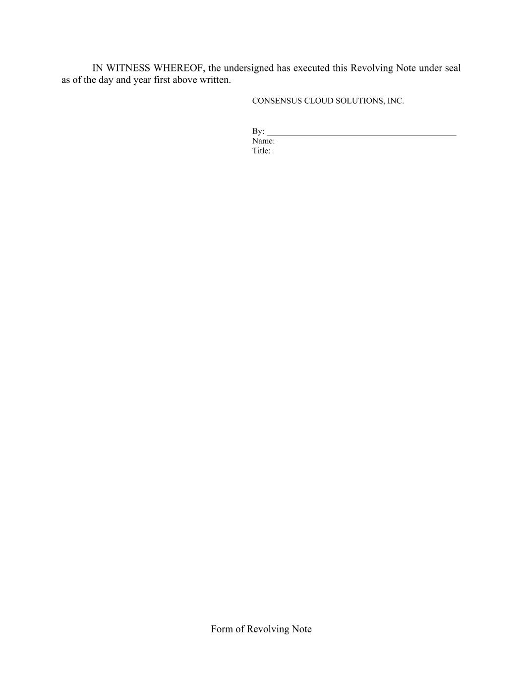 Form of Revolving Note IN WITNESS WHEREOF, the undersigned has executed this Revolving Note under seal as of the day and year first above written. CONSENSUS CLOUD SOLUTIONS, INC. By: ____________________________________________ Name: Title:
