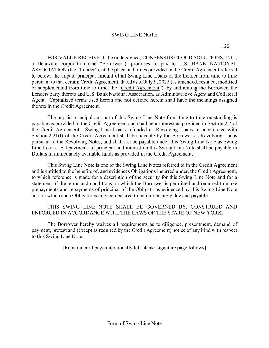 Form of Swing Line Note SWING LINE NOTE ____________, 20___ FOR VALUE RECEIVED, the undersigned, CONSENSUS CLOUD SOLUTIONS, INC., a Delaware corporation (the “Borrower”), promises to pay to U.S. BANK NATIONAL ASSOCIATION (the “Lender”), at the place and times provided in the Credit Agreement referred to below, the unpaid principal amount of all Swing Line Loans of the Lender from time to time pursuant to that certain Credit Agreement, dated as of July 9, 2025 (as amended, restated, modified or supplemented from time to time, the “Credit Agreement”), by and among the Borrower, the Lenders party thereto and U.S. Bank National Association, as Administrative Agent and Collateral Agent. Capitalized terms used herein and not defined herein shall have the meanings assigned thereto in the Credit Agreement. The unpaid principal amount of this Swing Line Note from time to time outstanding is payable as provided in the Credit Agreement and shall bear interest as provided in Section 2.7 of the Credit Agreement. Swing Line Loans refunded as Revolving Loans in accordance with Section 2.21(f) of the Credit Agreement shall be payable by the Borrower as Revolving Loans pursuant to the Revolving Notes, and shall not be payable under this Swing Line Note as Swing Line Loans. All payments of principal and interest on this Swing Line Note shall be payable in Dollars in immediately available funds as provided in the Credit Agreement. This Swing Line Note is one of the Swing Line Notes referred to in the Credit Agreement and is entitled to the benefits of, and evidences Obligations incurred under, the Credit Agreement, to which reference is made for a description of the security for this Swing Line Note and for a statement of the terms and conditions on which the Borrower is permitted and required to make prepayments and repayments of principal of the Obligations evidenced by this Swing Line Note and on which such Obligations may be declared to be immediately due and payable. THIS SWING LINE NOTE SHALL BE GOVERNED BY, CONSTRUED AND ENFORCED IN ACCORDANCE WITH THE LAWS OF THE STATE OF NEW YORK. The Borrower hereby waives all requirements as to diligence, presentment, demand of payment, protest and (except as required by the Credit Agreement) notice of any kind with respect to this Swing Line Note. [Remainder of page intentionally left blank; signature page follows]