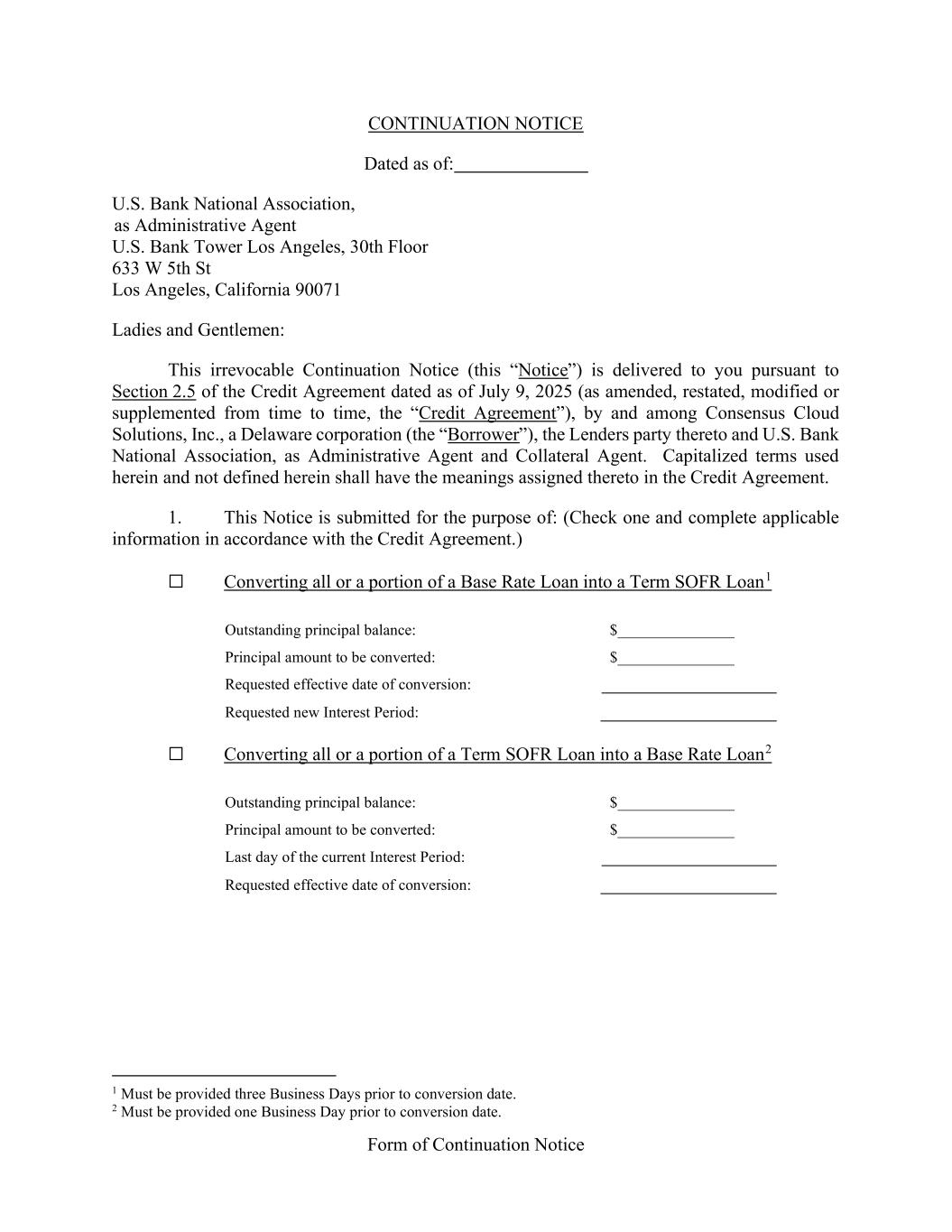 Form of Continuation Notice CONTINUATION NOTICE Dated as of: U.S. Bank National Association, as Administrative Agent U.S. Bank Tower Los Angeles, 30th Floor 633 W 5th St Los Angeles, California 90071 Ladies and Gentlemen: This irrevocable Continuation Notice (this “Notice”) is delivered to you pursuant to Section 2.5 of the Credit Agreement dated as of July 9, 2025 (as amended, restated, modified or supplemented from time to time, the “Credit Agreement”), by and among Consensus Cloud Solutions, Inc., a Delaware corporation (the “Borrower”), the Lenders party thereto and U.S. Bank National Association, as Administrative Agent and Collateral Agent. Capitalized terms used herein and not defined herein shall have the meanings assigned thereto in the Credit Agreement. 1. This Notice is submitted for the purpose of: (Check one and complete applicable information in accordance with the Credit Agreement.) Converting all or a portion of a Base Rate Loan into a Term SOFR Loan1 Outstanding principal balance: $_______________ Principal amount to be converted: $_______________ Requested effective date of conversion: Requested new Interest Period: Converting all or a portion of a Term SOFR Loan into a Base Rate Loan2 Outstanding principal balance: $_______________ Principal amount to be converted: $_______________ Last day of the current Interest Period: Requested effective date of conversion: 1 Must be provided three Business Days prior to conversion date. 2 Must be provided one Business Day prior to conversion date.