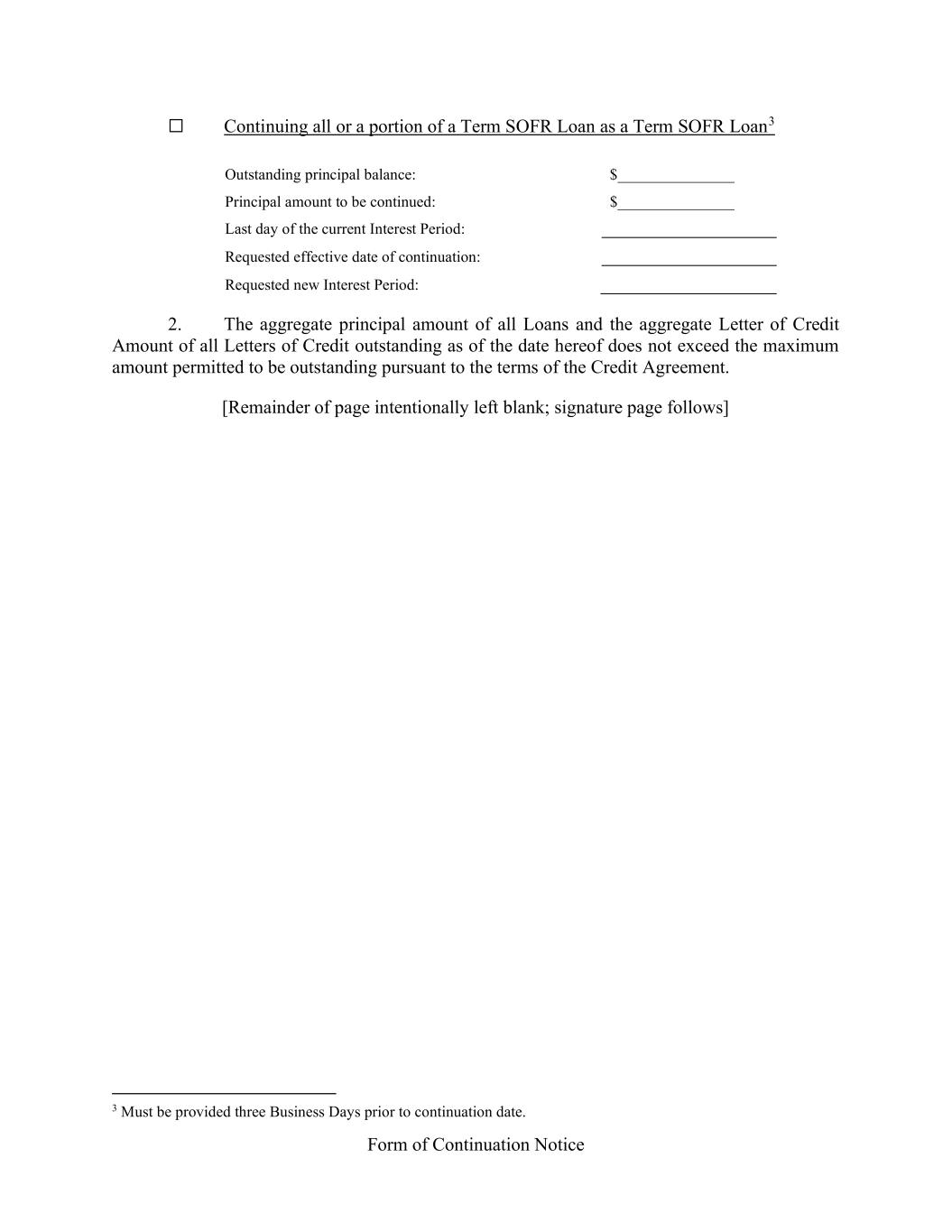 Form of Continuation Notice Continuing all or a portion of a Term SOFR Loan as a Term SOFR Loan3 Outstanding principal balance: $_______________ Principal amount to be continued: $_______________ Last day of the current Interest Period: Requested effective date of continuation: Requested new Interest Period: 2. The aggregate principal amount of all Loans and the aggregate Letter of Credit Amount of all Letters of Credit outstanding as of the date hereof does not exceed the maximum amount permitted to be outstanding pursuant to the terms of the Credit Agreement. [Remainder of page intentionally left blank; signature page follows] 3 Must be provided three Business Days prior to continuation date.