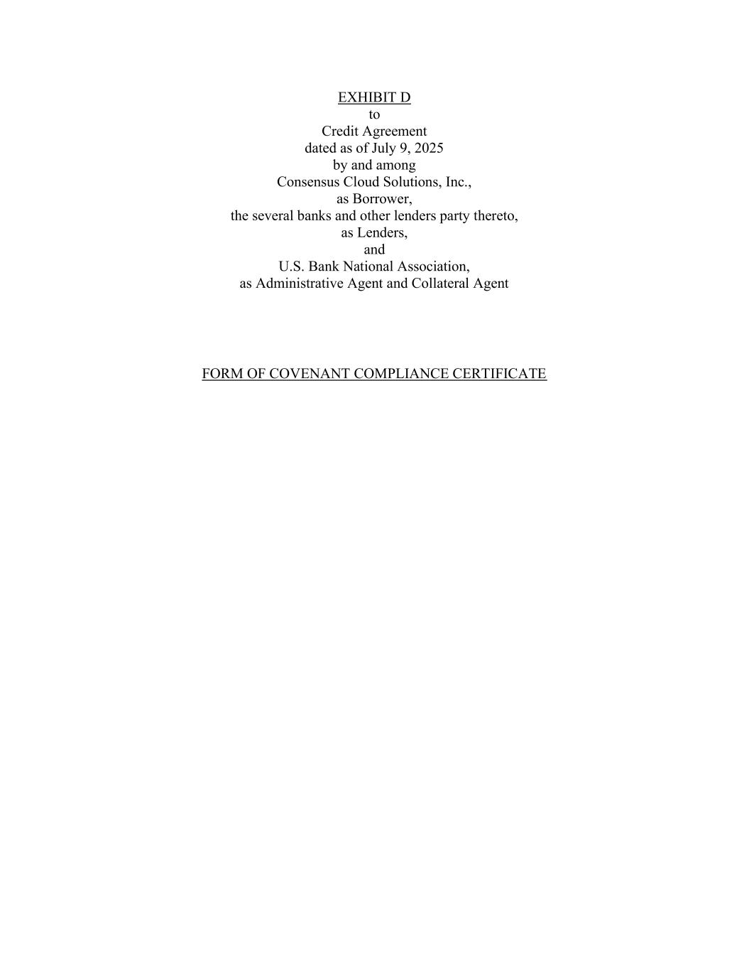 EXHIBIT D to Credit Agreement dated as of July 9, 2025 by and among Consensus Cloud Solutions, Inc., as Borrower, the several banks and other lenders party thereto, as Lenders, and U.S. Bank National Association, as Administrative Agent and Collateral Agent FORM OF COVENANT COMPLIANCE CERTIFICATE