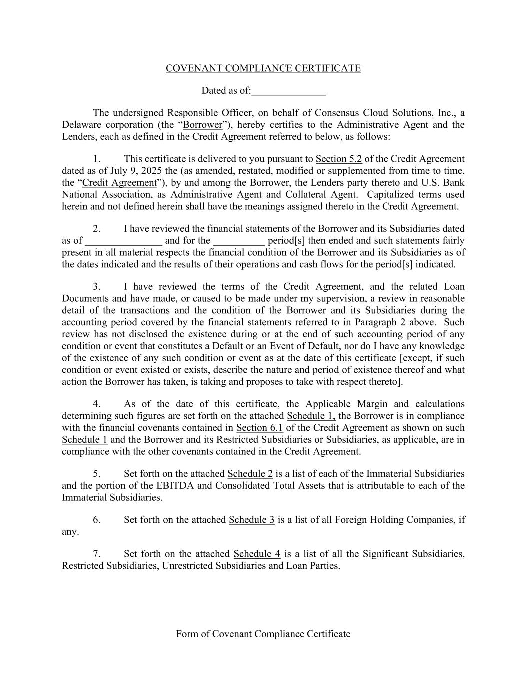 Form of Covenant Compliance Certificate COVENANT COMPLIANCE CERTIFICATE Dated as of: The undersigned Responsible Officer, on behalf of Consensus Cloud Solutions, Inc., a Delaware corporation (the “Borrower”), hereby certifies to the Administrative Agent and the Lenders, each as defined in the Credit Agreement referred to below, as follows: 1. This certificate is delivered to you pursuant to Section 5.2 of the Credit Agreement dated as of July 9, 2025 the (as amended, restated, modified or supplemented from time to time, the “Credit Agreement”), by and among the Borrower, the Lenders party thereto and U.S. Bank National Association, as Administrative Agent and Collateral Agent. Capitalized terms used herein and not defined herein shall have the meanings assigned thereto in the Credit Agreement. 2. I have reviewed the financial statements of the Borrower and its Subsidiaries dated as of _______________ and for the __________ period[s] then ended and such statements fairly present in all material respects the financial condition of the Borrower and its Subsidiaries as of the dates indicated and the results of their operations and cash flows for the period[s] indicated. 3. I have reviewed the terms of the Credit Agreement, and the related Loan Documents and have made, or caused to be made under my supervision, a review in reasonable detail of the transactions and the condition of the Borrower and its Subsidiaries during the accounting period covered by the financial statements referred to in Paragraph 2 above. Such review has not disclosed the existence during or at the end of such accounting period of any condition or event that constitutes a Default or an Event of Default, nor do I have any knowledge of the existence of any such condition or event as at the date of this certificate [except, if such condition or event existed or exists, describe the nature and period of existence thereof and what action the Borrower has taken, is taking and proposes to take with respect thereto]. 4. As of the date of this certificate, the Applicable Margin and calculations determining such figures are set forth on the attached Schedule 1, the Borrower is in compliance with the financial covenants contained in Section 6.1 of the Credit Agreement as shown on such Schedule 1 and the Borrower and its Restricted Subsidiaries or Subsidiaries, as applicable, are in compliance with the other covenants contained in the Credit Agreement. 5. Set forth on the attached Schedule 2 is a list of each of the Immaterial Subsidiaries and the portion of the EBITDA and Consolidated Total Assets that is attributable to each of the Immaterial Subsidiaries. 6. Set forth on the attached Schedule 3 is a list of all Foreign Holding Companies, if any. 7. Set forth on the attached Schedule 4 is a list of all the Significant Subsidiaries, Restricted Subsidiaries, Unrestricted Subsidiaries and Loan Parties.
