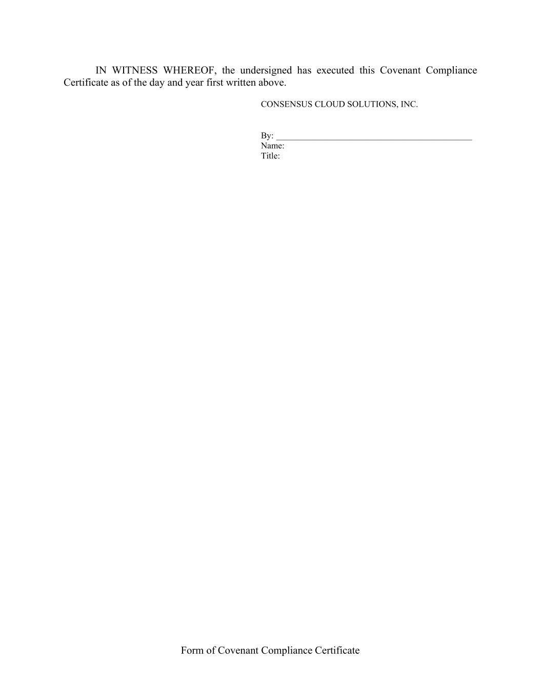 Form of Covenant Compliance Certificate IN WITNESS WHEREOF, the undersigned has executed this Covenant Compliance Certificate as of the day and year first written above. CONSENSUS CLOUD SOLUTIONS, INC. By: ____________________________________________ Name: Title: