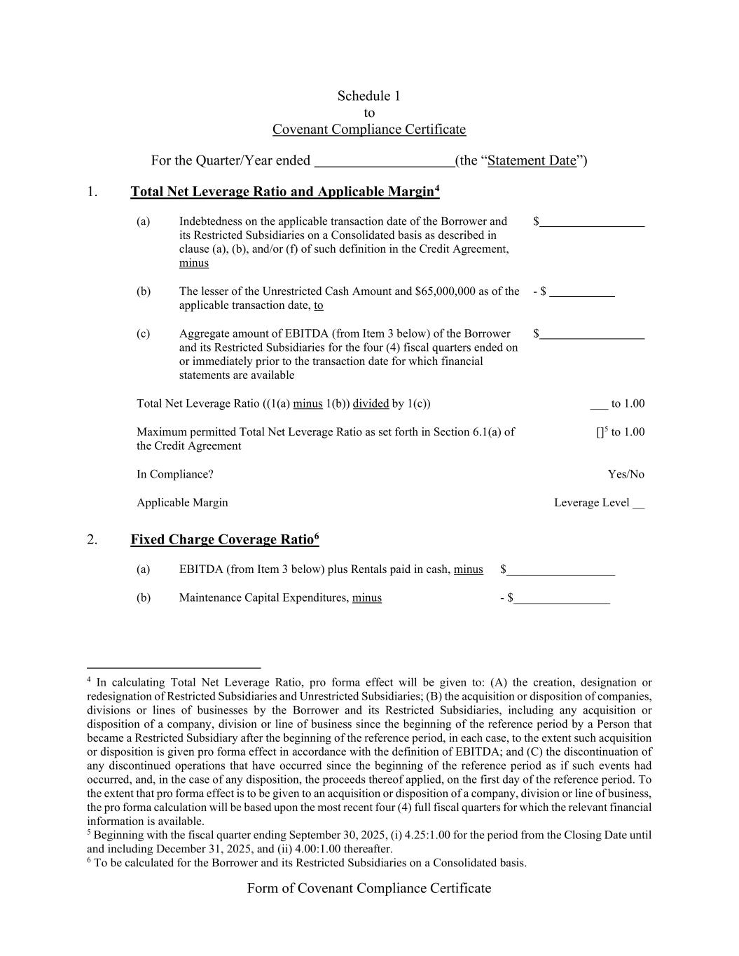 Form of Covenant Compliance Certificate Schedule 1 to Covenant Compliance Certificate For the Quarter/Year ended (the “Statement Date”) 1. Total Net Leverage Ratio and Applicable Margin4 (a) Indebtedness on the applicable transaction date of the Borrower and its Restricted Subsidiaries on a Consolidated basis as described in clause (a), (b), and/or (f) of such definition in the Credit Agreement, minus $ (b) The lesser of the Unrestricted Cash Amount and $65,000,000 as of the applicable transaction date, to - $ (c) Aggregate amount of EBITDA (from Item 3 below) of the Borrower and its Restricted Subsidiaries for the four (4) fiscal quarters ended on or immediately prior to the transaction date for which financial statements are available $ Total Net Leverage Ratio ((1(a) minus 1(b)) divided by 1(c)) ___ to 1.00 Maximum permitted Total Net Leverage Ratio as set forth in Section 6.1(a) of the Credit Agreement []5 to 1.00 In Compliance? Yes/No Applicable Margin Leverage Level __ 2. Fixed Charge Coverage Ratio6 (a) EBITDA (from Item 3 below) plus Rentals paid in cash, minus $__________________ (b) Maintenance Capital Expenditures, minus - $________________ 4 In calculating Total Net Leverage Ratio, pro forma effect will be given to: (A) the creation, designation or redesignation of Restricted Subsidiaries and Unrestricted Subsidiaries; (B) the acquisition or disposition of companies, divisions or lines of businesses by the Borrower and its Restricted Subsidiaries, including any acquisition or disposition of a company, division or line of business since the beginning of the reference period by a Person that became a Restricted Subsidiary after the beginning of the reference period, in each case, to the extent such acquisition or disposition is given pro forma effect in accordance with the definition of EBITDA; and (C) the discontinuation of any discontinued operations that have occurred since the beginning of the reference period as if such events had occurred, and, in the case of any disposition, the proceeds thereof applied, on the first day of the reference period. To the extent that pro forma effect is to be given to an acquisition or disposition of a company, division or line of business, the pro forma calculation will be based upon the most recent four (4) full fiscal quarters for which the relevant financial information is available. 5 Beginning with the fiscal quarter ending September 30, 2025, (i) 4.25:1.00 for the period from the Closing Date until and including December 31, 2025, and (ii) 4.00:1.00 thereafter. 6 To be calculated for the Borrower and its Restricted Subsidiaries on a Consolidated basis.
