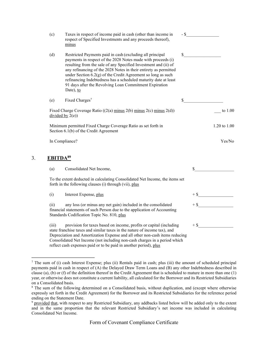 Form of Covenant Compliance Certificate (c) Taxes in respect of income paid in cash (other than income in respect of Specified Investments and any proceeds thereof), minus - $_______________ (d) Restricted Payments paid in cash (excluding all principal payments in respect of the 2028 Notes made with proceeds (i) resulting from the sale of any Specified Investment and (ii) of any refinancing of the 2028 Notes in their entirety as permitted under Section 6.2(g) of the Credit Agreement so long as such refinancing Indebtedness has a scheduled maturity date at least 91 days after the Revolving Loan Commitment Expiration Date), to $_________________ (e) Fixed Charges7 $__________________ Fixed Charge Coverage Ratio ((2(a) minus 2(b) minus 2(c) minus 2(d)) divided by 2(e)) ___ to 1.00 Minimum permitted Fixed Charge Coverage Ratio as set forth in Section 6.1(b) of the Credit Agreement 1.20 to 1.00 In Compliance? Yes/No 3. EBITDA89 (a) Consolidated Net Income, $__________________ To the extent deducted in calculating Consolidated Net Income, the items set forth in the following clauses (i) through (vii), plus (i) Interest Expense, plus + $________________ (ii) any loss (or minus any net gain) included in the consolidated financial statements of such Person due to the application of Accounting Standards Codification Topic No. 810, plus + $________________ (iii) provision for taxes based on income, profits or capital (including state franchise taxes and similar taxes in the nature of income tax), and Depreciation and Amortization Expense and all other non-cash items reducing Consolidated Net Income (not including non-cash charges in a period which reflect cash expenses paid or to be paid in another period), plus + $________________ 7 The sum of (i) cash Interest Expense; plus (ii) Rentals paid in cash; plus (iii) the amount of scheduled principal payments paid in cash in respect of (A) the Delayed Draw Term Loans and (B) any other Indebtedness described in clause (a), (b) or (f) of the definition thereof in the Credit Agreement that is scheduled to mature in more than one (1) year, or otherwise does not constitute a current liability, all calculated for the Borrower and its Restricted Subsidiaries on a Consolidated basis. 8 The sum of the following determined on a Consolidated basis, without duplication, and (except where otherwise expressly set forth in the Credit Agreement) for the Borrower and its Restricted Subsidiaries for the reference period ending on the Statement Date. 9 provided that, with respect to any Restricted Subsidiary, any addbacks listed below will be added only to the extent and in the same proportion that the relevant Restricted Subsidiary’s net income was included in calculating Consolidated Net Income.