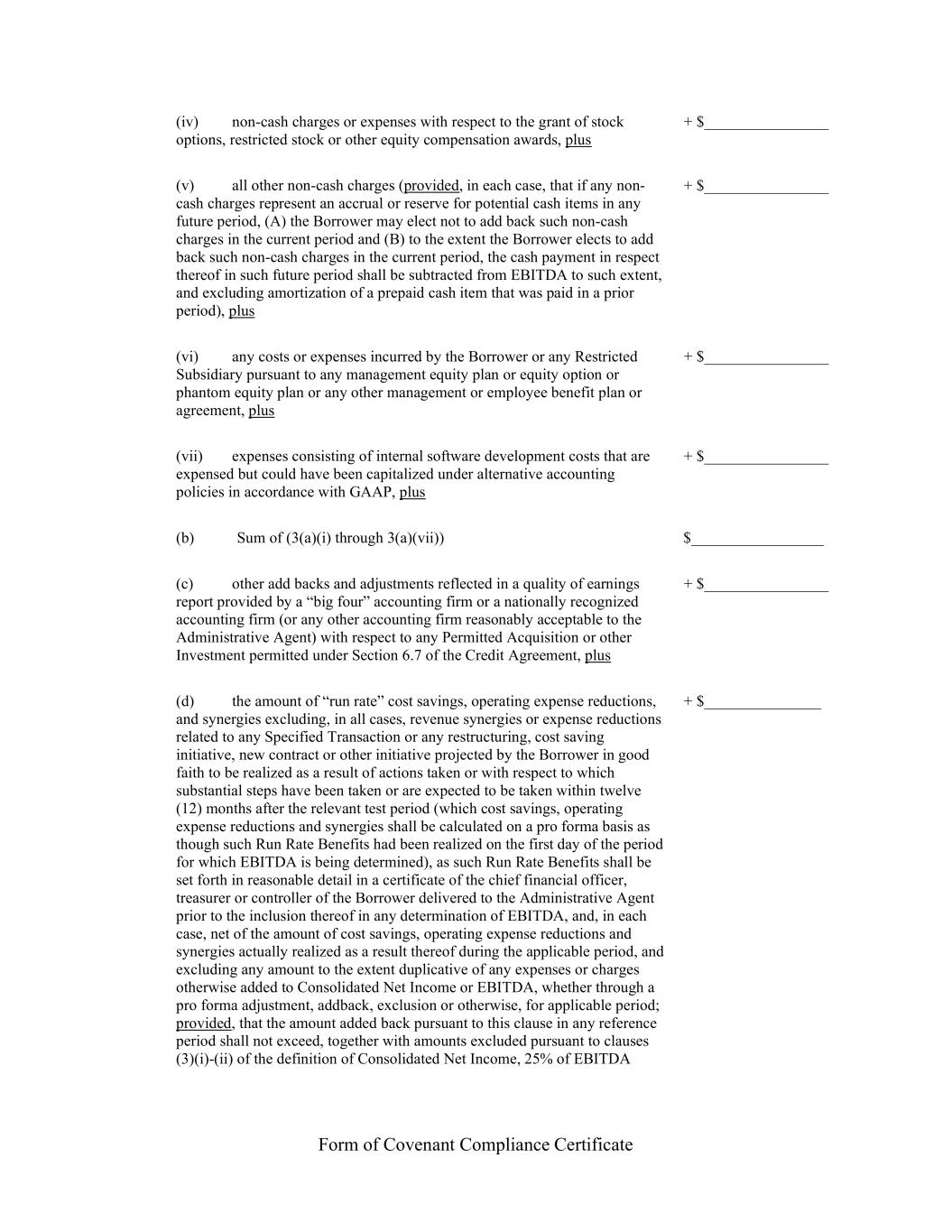 Form of Covenant Compliance Certificate (iv) non-cash charges or expenses with respect to the grant of stock options, restricted stock or other equity compensation awards, plus + $________________ (v) all other non-cash charges (provided, in each case, that if any non- cash charges represent an accrual or reserve for potential cash items in any future period, (A) the Borrower may elect not to add back such non-cash charges in the current period and (B) to the extent the Borrower elects to add back such non-cash charges in the current period, the cash payment in respect thereof in such future period shall be subtracted from EBITDA to such extent, and excluding amortization of a prepaid cash item that was paid in a prior period), plus + $________________ (vi) any costs or expenses incurred by the Borrower or any Restricted Subsidiary pursuant to any management equity plan or equity option or phantom equity plan or any other management or employee benefit plan or agreement, plus + $________________ (vii) expenses consisting of internal software development costs that are expensed but could have been capitalized under alternative accounting policies in accordance with GAAP, plus + $________________ (b) Sum of (3(a)(i) through 3(a)(vii)) $_________________ (c) other add backs and adjustments reflected in a quality of earnings report provided by a “big four” accounting firm or a nationally recognized accounting firm (or any other accounting firm reasonably acceptable to the Administrative Agent) with respect to any Permitted Acquisition or other Investment permitted under Section 6.7 of the Credit Agreement, plus + $________________ (d) the amount of “run rate” cost savings, operating expense reductions, and synergies excluding, in all cases, revenue synergies or expense reductions related to any Specified Transaction or any restructuring, cost saving initiative, new contract or other initiative projected by the Borrower in good faith to be realized as a result of actions taken or with respect to which substantial steps have been taken or are expected to be taken within twelve (12) months after the relevant test period (which cost savings, operating expense reductions and synergies shall be calculated on a pro forma basis as though such Run Rate Benefits had been realized on the first day of the period for which EBITDA is being determined), as such Run Rate Benefits shall be set forth in reasonable detail in a certificate of the chief financial officer, treasurer or controller of the Borrower delivered to the Administrative Agent prior to the inclusion thereof in any determination of EBITDA, and, in each case, net of the amount of cost savings, operating expense reductions and synergies actually realized as a result thereof during the applicable period, and excluding any amount to the extent duplicative of any expenses or charges otherwise added to Consolidated Net Income or EBITDA, whether through a pro forma adjustment, addback, exclusion or otherwise, for applicable period; provided, that the amount added back pursuant to this clause in any reference period shall not exceed, together with amounts excluded pursuant to clauses (3)(i)-(ii) of the definition of Consolidated Net Income, 25% of EBITDA + $_______________