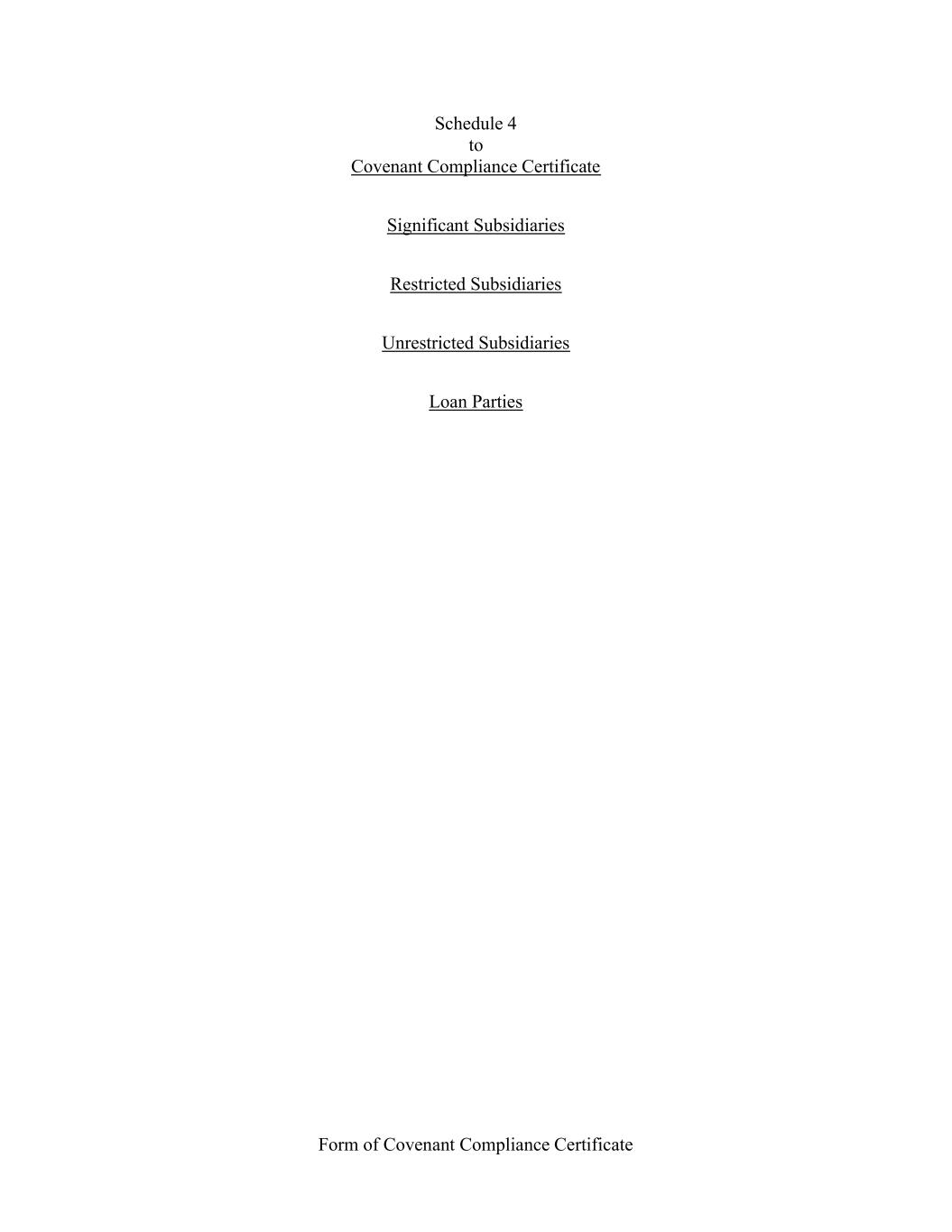 Form of Covenant Compliance Certificate Schedule 4 to Covenant Compliance Certificate Significant Subsidiaries Restricted Subsidiaries Unrestricted Subsidiaries Loan Parties