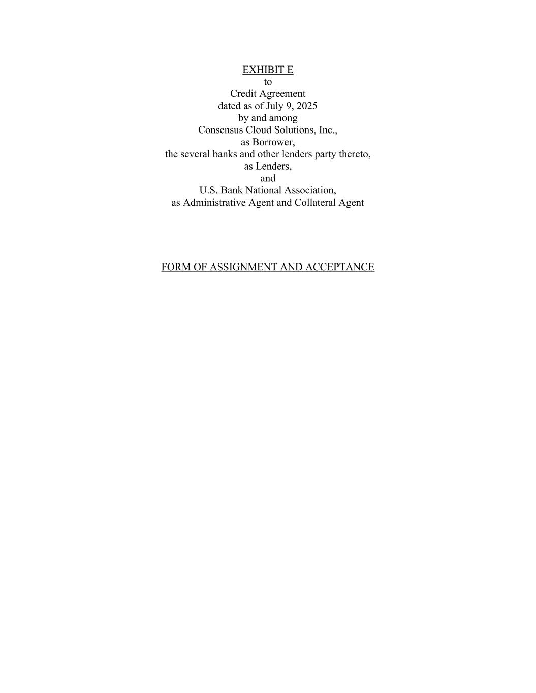 EXHIBIT E to Credit Agreement dated as of July 9, 2025 by and among Consensus Cloud Solutions, Inc., as Borrower, the several banks and other lenders party thereto, as Lenders, and U.S. Bank National Association, as Administrative Agent and Collateral Agent FORM OF ASSIGNMENT AND ACCEPTANCE