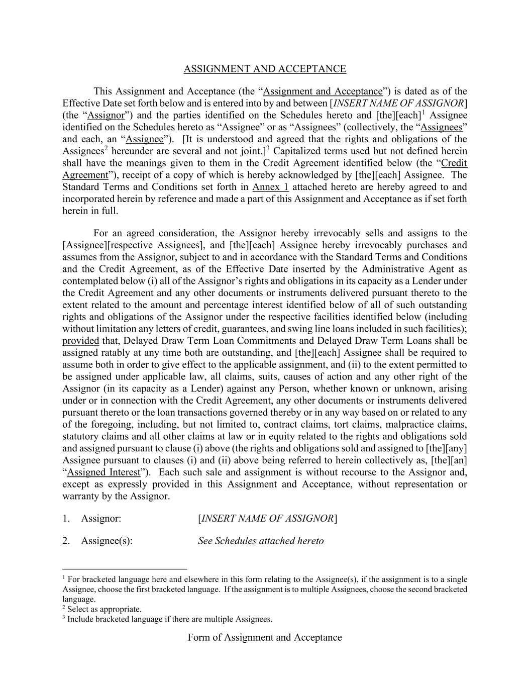 Form of Assignment and Acceptance ASSIGNMENT AND ACCEPTANCE This Assignment and Acceptance (the “Assignment and Acceptance”) is dated as of the Effective Date set forth below and is entered into by and between [INSERT NAME OF ASSIGNOR] (the “Assignor”) and the parties identified on the Schedules hereto and [the][each]1 Assignee identified on the Schedules hereto as “Assignee” or as “Assignees” (collectively, the “Assignees” and each, an “Assignee”). [It is understood and agreed that the rights and obligations of the Assignees2 hereunder are several and not joint.]3 Capitalized terms used but not defined herein shall have the meanings given to them in the Credit Agreement identified below (the “Credit Agreement”), receipt of a copy of which is hereby acknowledged by [the][each] Assignee. The Standard Terms and Conditions set forth in Annex 1 attached hereto are hereby agreed to and incorporated herein by reference and made a part of this Assignment and Acceptance as if set forth herein in full. For an agreed consideration, the Assignor hereby irrevocably sells and assigns to the [Assignee][respective Assignees], and [the][each] Assignee hereby irrevocably purchases and assumes from the Assignor, subject to and in accordance with the Standard Terms and Conditions and the Credit Agreement, as of the Effective Date inserted by the Administrative Agent as contemplated below (i) all of the Assignor’s rights and obligations in its capacity as a Lender under the Credit Agreement and any other documents or instruments delivered pursuant thereto to the extent related to the amount and percentage interest identified below of all of such outstanding rights and obligations of the Assignor under the respective facilities identified below (including without limitation any letters of credit, guarantees, and swing line loans included in such facilities); provided that, Delayed Draw Term Loan Commitments and Delayed Draw Term Loans shall be assigned ratably at any time both are outstanding, and [the][each] Assignee shall be required to assume both in order to give effect to the applicable assignment, and (ii) to the extent permitted to be assigned under applicable law, all claims, suits, causes of action and any other right of the Assignor (in its capacity as a Lender) against any Person, whether known or unknown, arising under or in connection with the Credit Agreement, any other documents or instruments delivered pursuant thereto or the loan transactions governed thereby or in any way based on or related to any of the foregoing, including, but not limited to, contract claims, tort claims, malpractice claims, statutory claims and all other claims at law or in equity related to the rights and obligations sold and assigned pursuant to clause (i) above (the rights and obligations sold and assigned to [the][any] Assignee pursuant to clauses (i) and (ii) above being referred to herein collectively as, [the][an] “Assigned Interest”). Each such sale and assignment is without recourse to the Assignor and, except as expressly provided in this Assignment and Acceptance, without representation or warranty by the Assignor. 1. Assignor: [INSERT NAME OF ASSIGNOR] 2. Assignee(s): See Schedules attached hereto 1 For bracketed language here and elsewhere in this form relating to the Assignee(s), if the assignment is to a single Assignee, choose the first bracketed language. If the assignment is to multiple Assignees, choose the second bracketed language. 2 Select as appropriate. 3 Include bracketed language if there are multiple Assignees.