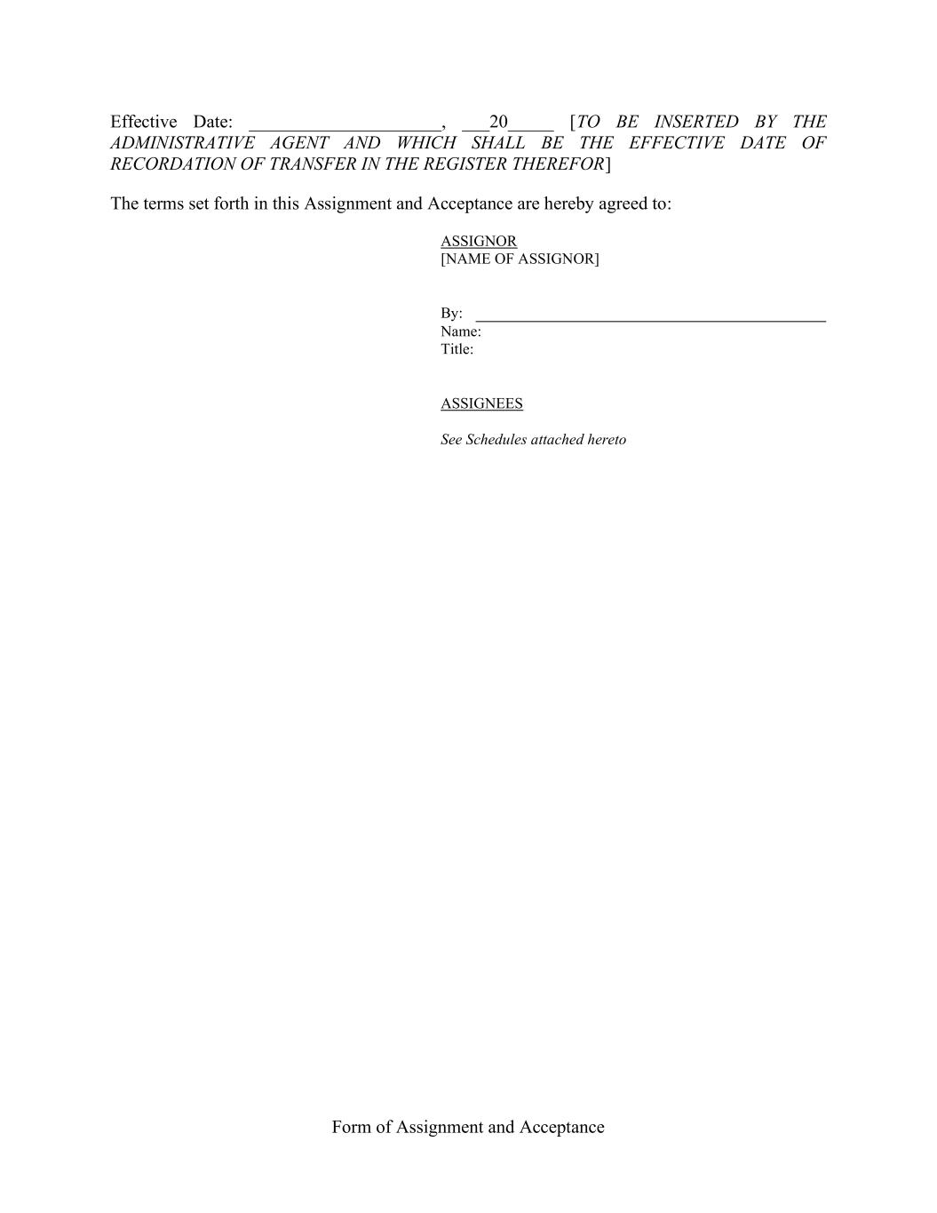 Form of Assignment and Acceptance Effective Date: _____________________, ___20_____ [TO BE INSERTED BY THE ADMINISTRATIVE AGENT AND WHICH SHALL BE THE EFFECTIVE DATE OF RECORDATION OF TRANSFER IN THE REGISTER THEREFOR] The terms set forth in this Assignment and Acceptance are hereby agreed to: ASSIGNOR [NAME OF ASSIGNOR] By: Name: Title: ASSIGNEES See Schedules attached hereto