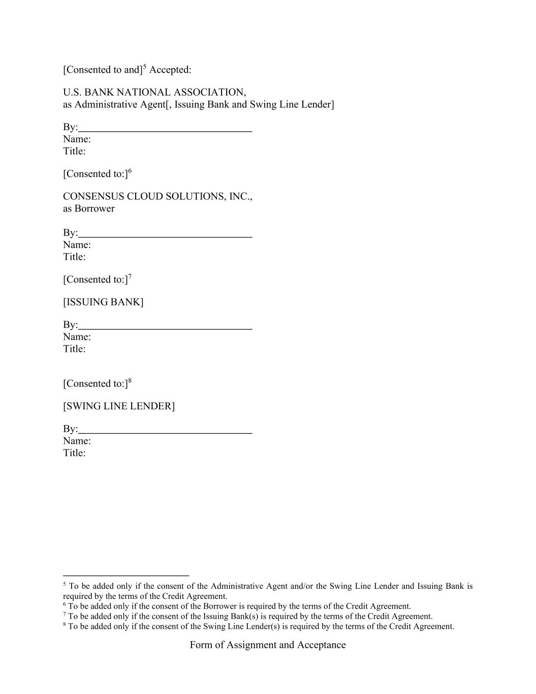 Form of Assignment and Acceptance [Consented to and]5 Accepted: U.S. BANK NATIONAL ASSOCIATION, as Administrative Agent[, Issuing Bank and Swing Line Lender] By: Name: Title: [Consented to:]6 CONSENSUS CLOUD SOLUTIONS, INC., as Borrower By: Name: Title: [Consented to:]7 [ISSUING BANK] By: Name: Title: [Consented to:]8 [SWING LINE LENDER] By: Name: Title: 5 To be added only if the consent of the Administrative Agent and/or the Swing Line Lender and Issuing Bank is required by the terms of the Credit Agreement. 6 To be added only if the consent of the Borrower is required by the terms of the Credit Agreement. 7 To be added only if the consent of the Issuing Bank(s) is required by the terms of the Credit Agreement. 8 To be added only if the consent of the Swing Line Lender(s) is required by the terms of the Credit Agreement.