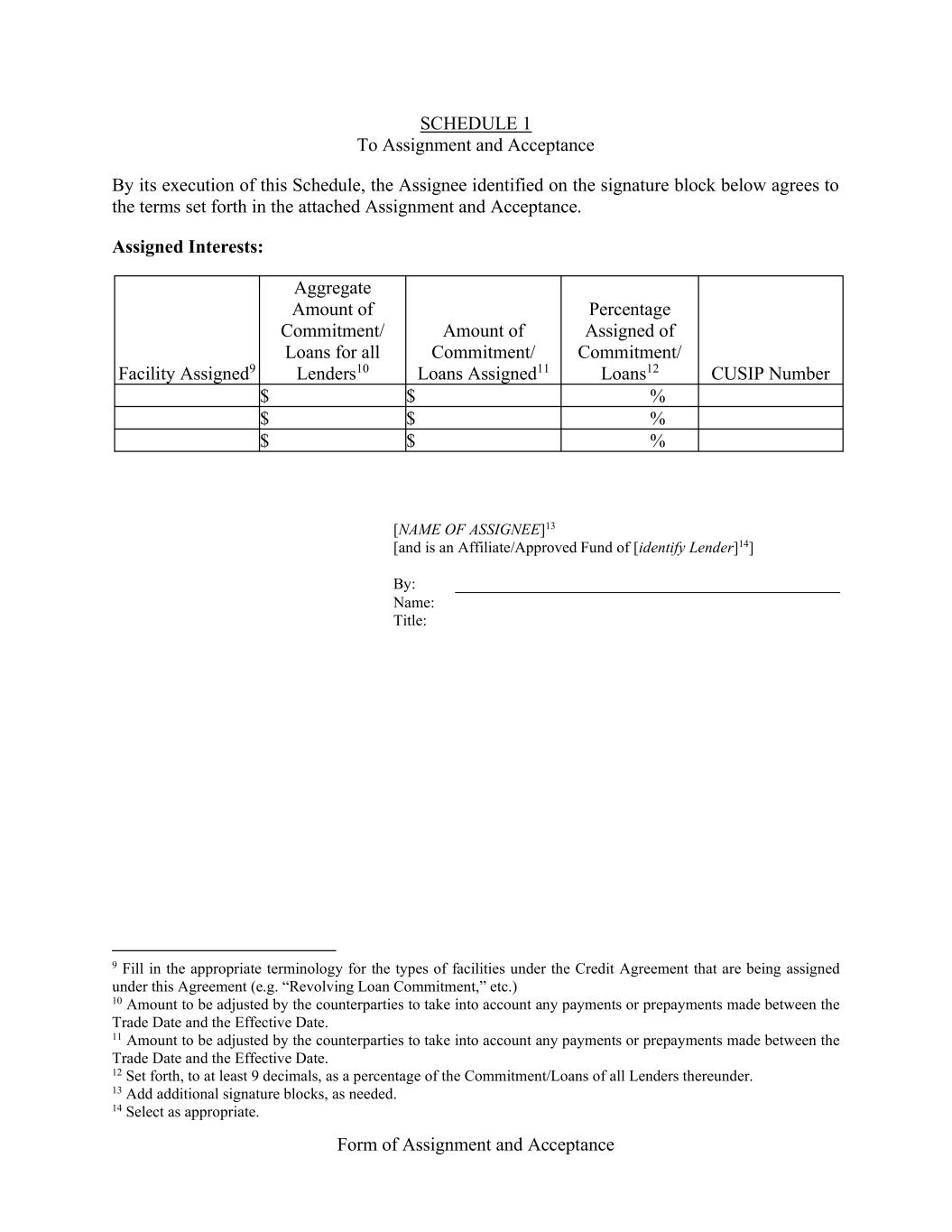 Form of Assignment and Acceptance SCHEDULE 1 To Assignment and Acceptance By its execution of this Schedule, the Assignee identified on the signature block below agrees to the terms set forth in the attached Assignment and Acceptance. Assigned Interests: Facility Assigned9 Aggregate Amount of Commitment/ Loans for all Lenders10 Amount of Commitment/ Loans Assigned11 Percentage Assigned of Commitment/ Loans12 CUSIP Number $ $ % $ $ % $ $ % [NAME OF ASSIGNEE]13 [and is an Affiliate/Approved Fund of [identify Lender]14] By: Name: Title: 9 Fill in the appropriate terminology for the types of facilities under the Credit Agreement that are being assigned under this Agreement (e.g. “Revolving Loan Commitment,” etc.) 10 Amount to be adjusted by the counterparties to take into account any payments or prepayments made between the Trade Date and the Effective Date. 11 Amount to be adjusted by the counterparties to take into account any payments or prepayments made between the Trade Date and the Effective Date. 12 Set forth, to at least 9 decimals, as a percentage of the Commitment/Loans of all Lenders thereunder. 13 Add additional signature blocks, as needed. 14 Select as appropriate.