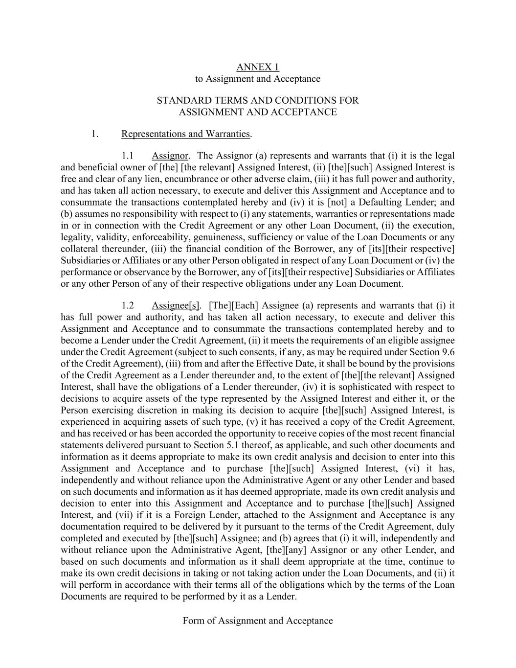 Form of Assignment and Acceptance ANNEX 1 to Assignment and Acceptance STANDARD TERMS AND CONDITIONS FOR ASSIGNMENT AND ACCEPTANCE 1. Representations and Warranties. 1.1 Assignor. The Assignor (a) represents and warrants that (i) it is the legal and beneficial owner of [the] [the relevant] Assigned Interest, (ii) [the][such] Assigned Interest is free and clear of any lien, encumbrance or other adverse claim, (iii) it has full power and authority, and has taken all action necessary, to execute and deliver this Assignment and Acceptance and to consummate the transactions contemplated hereby and (iv) it is [not] a Defaulting Lender; and (b) assumes no responsibility with respect to (i) any statements, warranties or representations made in or in connection with the Credit Agreement or any other Loan Document, (ii) the execution, legality, validity, enforceability, genuineness, sufficiency or value of the Loan Documents or any collateral thereunder, (iii) the financial condition of the Borrower, any of [its][their respective] Subsidiaries or Affiliates or any other Person obligated in respect of any Loan Document or (iv) the performance or observance by the Borrower, any of [its][their respective] Subsidiaries or Affiliates or any other Person of any of their respective obligations under any Loan Document. 1.2 Assignee[s]. [The][Each] Assignee (a) represents and warrants that (i) it has full power and authority, and has taken all action necessary, to execute and deliver this Assignment and Acceptance and to consummate the transactions contemplated hereby and to become a Lender under the Credit Agreement, (ii) it meets the requirements of an eligible assignee under the Credit Agreement (subject to such consents, if any, as may be required under Section 9.6 of the Credit Agreement), (iii) from and after the Effective Date, it shall be bound by the provisions of the Credit Agreement as a Lender thereunder and, to the extent of [the][the relevant] Assigned Interest, shall have the obligations of a Lender thereunder, (iv) it is sophisticated with respect to decisions to acquire assets of the type represented by the Assigned Interest and either it, or the Person exercising discretion in making its decision to acquire [the][such] Assigned Interest, is experienced in acquiring assets of such type, (v) it has received a copy of the Credit Agreement, and has received or has been accorded the opportunity to receive copies of the most recent financial statements delivered pursuant to Section 5.1 thereof, as applicable, and such other documents and information as it deems appropriate to make its own credit analysis and decision to enter into this Assignment and Acceptance and to purchase [the][such] Assigned Interest, (vi) it has, independently and without reliance upon the Administrative Agent or any other Lender and based on such documents and information as it has deemed appropriate, made its own credit analysis and decision to enter into this Assignment and Acceptance and to purchase [the][such] Assigned Interest, and (vii) if it is a Foreign Lender, attached to the Assignment and Acceptance is any documentation required to be delivered by it pursuant to the terms of the Credit Agreement, duly completed and executed by [the][such] Assignee; and (b) agrees that (i) it will, independently and without reliance upon the Administrative Agent, [the][any] Assignor or any other Lender, and based on such documents and information as it shall deem appropriate at the time, continue to make its own credit decisions in taking or not taking action under the Loan Documents, and (ii) it will perform in accordance with their terms all of the obligations which by the terms of the Loan Documents are required to be performed by it as a Lender.