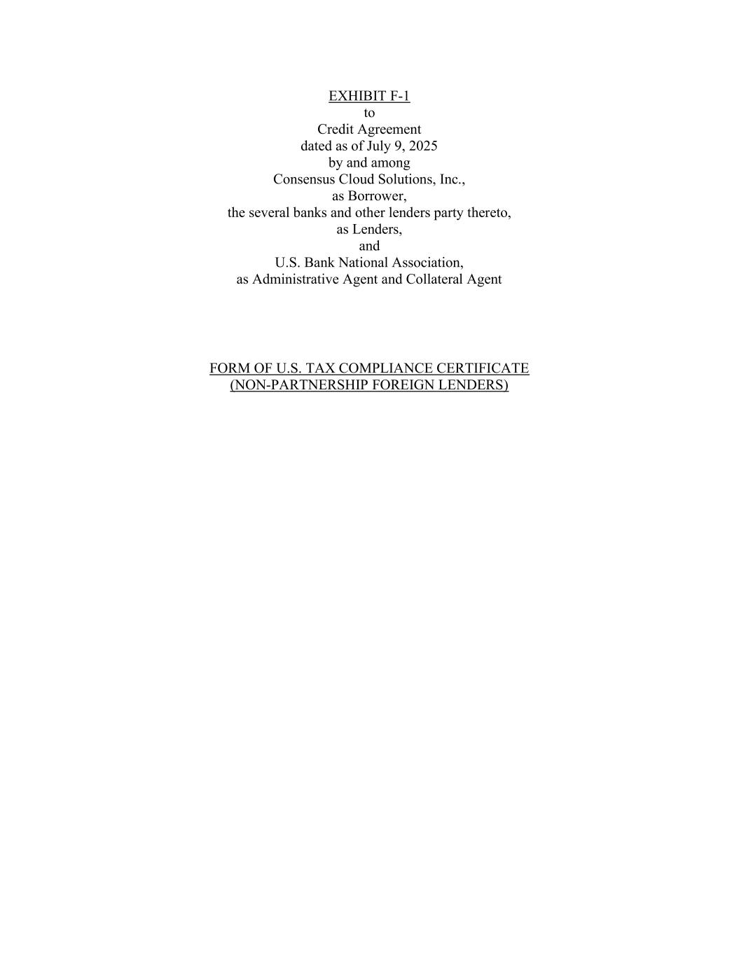 EXHIBIT F-1 to Credit Agreement dated as of July 9, 2025 by and among Consensus Cloud Solutions, Inc., as Borrower, the several banks and other lenders party thereto, as Lenders, and U.S. Bank National Association, as Administrative Agent and Collateral Agent FORM OF U.S. TAX COMPLIANCE CERTIFICATE (NON-PARTNERSHIP FOREIGN LENDERS)