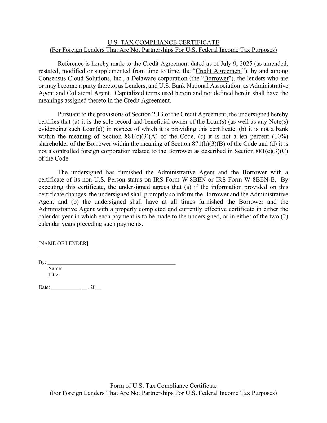 Form of U.S. Tax Compliance Certificate (For Foreign Lenders That Are Not Partnerships For U.S. Federal Income Tax Purposes) U.S. TAX COMPLIANCE CERTIFICATE (For Foreign Lenders That Are Not Partnerships For U.S. Federal Income Tax Purposes) Reference is hereby made to the Credit Agreement dated as of July 9, 2025 (as amended, restated, modified or supplemented from time to time, the “Credit Agreement”), by and among Consensus Cloud Solutions, Inc., a Delaware corporation (the “Borrower”), the lenders who are or may become a party thereto, as Lenders, and U.S. Bank National Association, as Administrative Agent and Collateral Agent. Capitalized terms used herein and not defined herein shall have the meanings assigned thereto in the Credit Agreement. Pursuant to the provisions of Section 2.13 of the Credit Agreement, the undersigned hereby certifies that (a) it is the sole record and beneficial owner of the Loan(s) (as well as any Note(s) evidencing such Loan(s)) in respect of which it is providing this certificate, (b) it is not a bank within the meaning of Section 881(c)(3)(A) of the Code, (c) it is not a ten percent (10%) shareholder of the Borrower within the meaning of Section 871(h)(3)(B) of the Code and (d) it is not a controlled foreign corporation related to the Borrower as described in Section 881(c)(3)(C) of the Code. The undersigned has furnished the Administrative Agent and the Borrower with a certificate of its non-U.S. Person status on IRS Form W-8BEN or IRS Form W-8BEN-E. By executing this certificate, the undersigned agrees that (a) if the information provided on this certificate changes, the undersigned shall promptly so inform the Borrower and the Administrative Agent and (b) the undersigned shall have at all times furnished the Borrower and the Administrative Agent with a properly completed and currently effective certificate in either the calendar year in which each payment is to be made to the undersigned, or in either of the two (2) calendar years preceding such payments. [NAME OF LENDER] By: Name: Title: Date: ___________ __, 20__