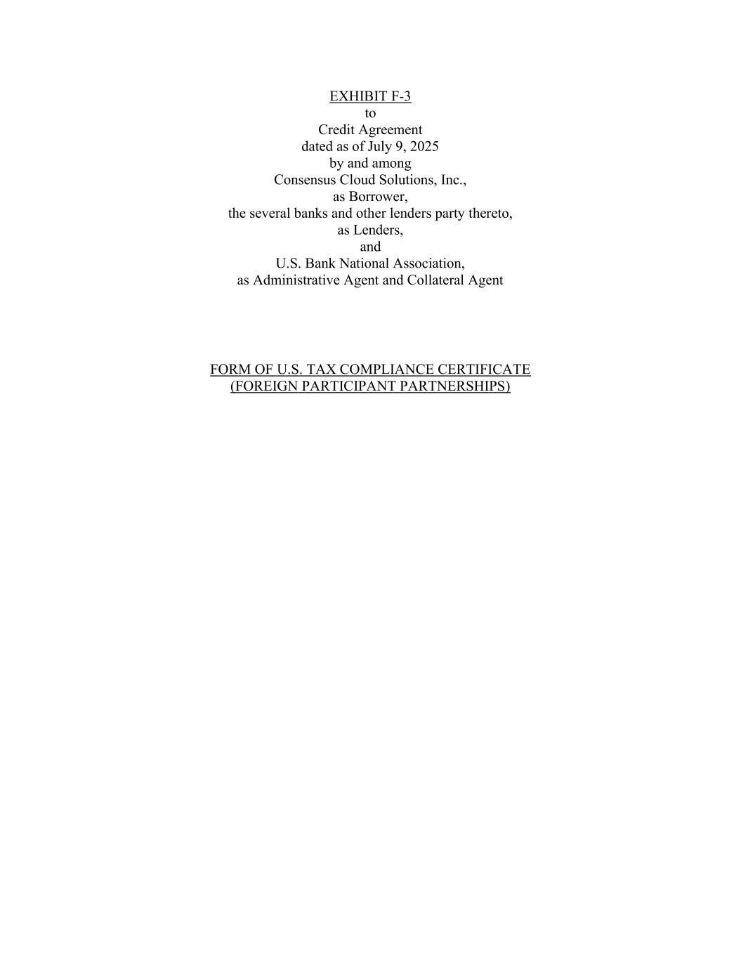 EXHIBIT F-3 to Credit Agreement dated as of July 9, 2025 by and among Consensus Cloud Solutions, Inc., as Borrower, the several banks and other lenders party thereto, as Lenders, and U.S. Bank National Association, as Administrative Agent and Collateral Agent FORM OF U.S. TAX COMPLIANCE CERTIFICATE (FOREIGN PARTICIPANT PARTNERSHIPS)