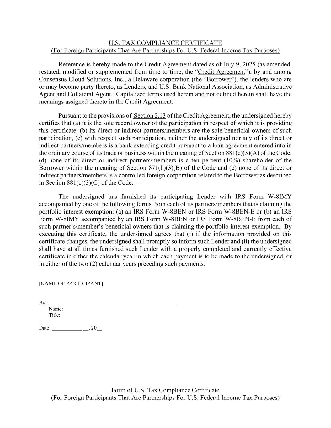 Form of U.S. Tax Compliance Certificate (For Foreign Participants That Are Partnerships For U.S. Federal Income Tax Purposes) U.S. TAX COMPLIANCE CERTIFICATE (For Foreign Participants That Are Partnerships For U.S. Federal Income Tax Purposes) Reference is hereby made to the Credit Agreement dated as of July 9, 2025 (as amended, restated, modified or supplemented from time to time, the “Credit Agreement”), by and among Consensus Cloud Solutions, Inc., a Delaware corporation (the “Borrower”), the lenders who are or may become party thereto, as Lenders, and U.S. Bank National Association, as Administrative Agent and Collateral Agent. Capitalized terms used herein and not defined herein shall have the meanings assigned thereto in the Credit Agreement. Pursuant to the provisions of Section 2.13 of the Credit Agreement, the undersigned hereby certifies that (a) it is the sole record owner of the participation in respect of which it is providing this certificate, (b) its direct or indirect partners/members are the sole beneficial owners of such participation, (c) with respect such participation, neither the undersigned nor any of its direct or indirect partners/members is a bank extending credit pursuant to a loan agreement entered into in the ordinary course of its trade or business within the meaning of Section 881(c)(3)(A) of the Code, (d) none of its direct or indirect partners/members is a ten percent (10%) shareholder of the Borrower within the meaning of Section 871(h)(3)(B) of the Code and (e) none of its direct or indirect partners/members is a controlled foreign corporation related to the Borrower as described in Section 881(c)(3)(C) of the Code. The undersigned has furnished its participating Lender with IRS Form W-8IMY accompanied by one of the following forms from each of its partners/members that is claiming the portfolio interest exemption: (a) an IRS Form W-8BEN or IRS Form W-8BEN-E or (b) an IRS Form W-8IMY accompanied by an IRS Form W-8BEN or IRS Form W-8BEN-E from each of such partner’s/member’s beneficial owners that is claiming the portfolio interest exemption. By executing this certificate, the undersigned agrees that (i) if the information provided on this certificate changes, the undersigned shall promptly so inform such Lender and (ii) the undersigned shall have at all times furnished such Lender with a properly completed and currently effective certificate in either the calendar year in which each payment is to be made to the undersigned, or in either of the two (2) calendar years preceding such payments. [NAME OF PARTICIPANT] By: Name: Title: Date: ___________ __, 20__
