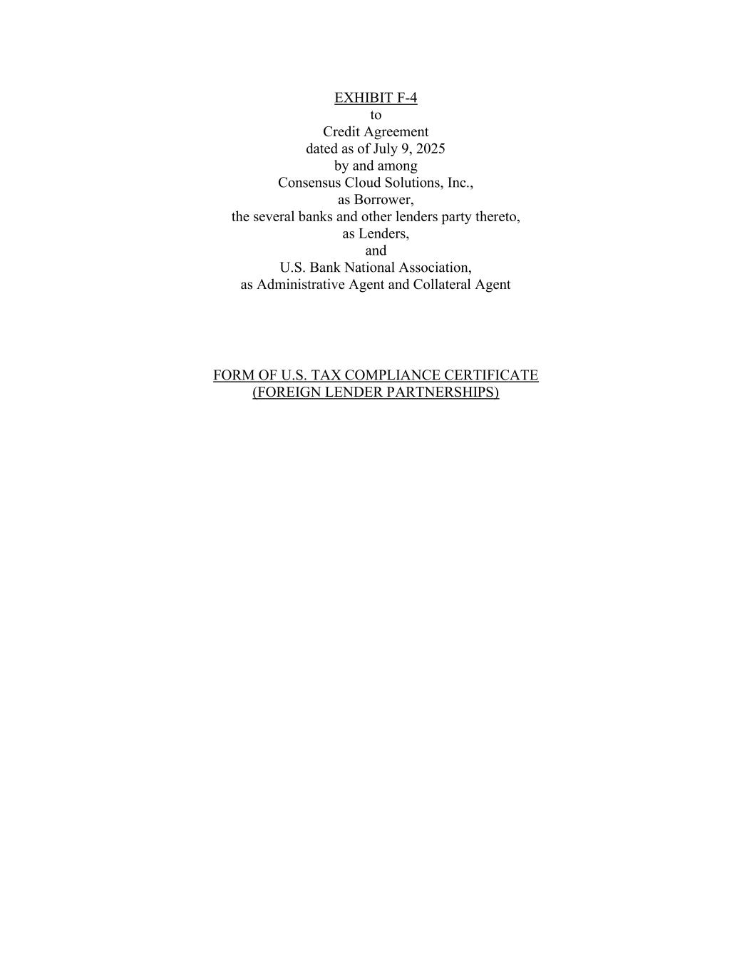 EXHIBIT F-4 to Credit Agreement dated as of July 9, 2025 by and among Consensus Cloud Solutions, Inc., as Borrower, the several banks and other lenders party thereto, as Lenders, and U.S. Bank National Association, as Administrative Agent and Collateral Agent FORM OF U.S. TAX COMPLIANCE CERTIFICATE (FOREIGN LENDER PARTNERSHIPS)