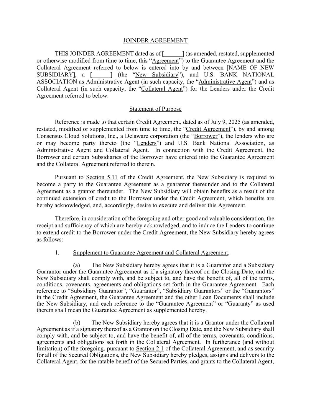 JOINDER AGREEMENT THIS JOINDER AGREEMENT dated as of [______] (as amended, restated, supplemented or otherwise modified from time to time, this “Agreement”) to the Guarantee Agreement and the Collateral Agreement referred to below is entered into by and between [NAME OF NEW SUBSIDIARY], a [______] (the “New Subsidiary”), and U.S. BANK NATIONAL ASSOCIATION as Administrative Agent (in such capacity, the “Administrative Agent”) and as Collateral Agent (in such capacity, the “Collateral Agent”) for the Lenders under the Credit Agreement referred to below. Statement of Purpose Reference is made to that certain Credit Agreement, dated as of July 9, 2025 (as amended, restated, modified or supplemented from time to time, the “Credit Agreement”), by and among Consensus Cloud Solutions, Inc., a Delaware corporation (the “Borrower”), the lenders who are or may become party thereto (the “Lenders”) and U.S. Bank National Association, as Administrative Agent and Collateral Agent. In connection with the Credit Agreement, the Borrower and certain Subsidiaries of the Borrower have entered into the Guarantee Agreement and the Collateral Agreement referred to therein. Pursuant to Section 5.11 of the Credit Agreement, the New Subsidiary is required to become a party to the Guarantee Agreement as a guarantor thereunder and to the Collateral Agreement as a grantor thereunder. The New Subsidiary will obtain benefits as a result of the continued extension of credit to the Borrower under the Credit Agreement, which benefits are hereby acknowledged, and, accordingly, desire to execute and deliver this Agreement. Therefore, in consideration of the foregoing and other good and valuable consideration, the receipt and sufficiency of which are hereby acknowledged, and to induce the Lenders to continue to extend credit to the Borrower under the Credit Agreement, the New Subsidiary hereby agrees as follows: 1. Supplement to Guarantee Agreement and Collateral Agreement. (a) The New Subsidiary hereby agrees that it is a Guarantor and a Subsidiary Guarantor under the Guarantee Agreement as if a signatory thereof on the Closing Date, and the New Subsidiary shall comply with, and be subject to, and have the benefit of, all of the terms, conditions, covenants, agreements and obligations set forth in the Guarantee Agreement. Each reference to “Subsidiary Guarantor”, “Guarantor”, “Subsidiary Guarantors” or the “Guarantors” in the Credit Agreement, the Guarantee Agreement and the other Loan Documents shall include the New Subsidiary, and each reference to the “Guarantee Agreement” or “Guaranty” as used therein shall mean the Guarantee Agreement as supplemented hereby. (b) The New Subsidiary hereby agrees that it is a Grantor under the Collateral Agreement as if a signatory thereof as a Grantor on the Closing Date, and the New Subsidiary shall comply with, and be subject to, and have the benefit of, all of the terms, covenants, conditions, agreements and obligations set forth in the Collateral Agreement. In furtherance (and without limitation) of the foregoing, pursuant to Section 2.1 of the Collateral Agreement, and as security for all of the Secured Obligations, the New Subsidiary hereby pledges, assigns and delivers to the Collateral Agent, for the ratable benefit of the Secured Parties, and grants to the Collateral Agent,