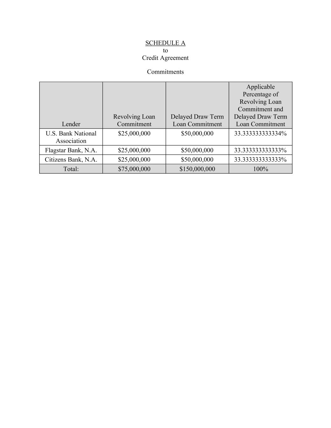 SCHEDULE A to Credit Agreement Commitments Lender Revolving Loan Commitment Delayed Draw Term Loan Commitment Applicable Percentage of Revolving Loan Commitment and Delayed Draw Term Loan Commitment U.S. Bank National Association $25,000,000 $50,000,000 33.333333333334% Flagstar Bank, N.A. $25,000,000 $50,000,000 33.333333333333% Citizens Bank, N.A. $25,000,000 $50,000,000 33.333333333333% Total: $75,000,000 $150,000,000 100%
