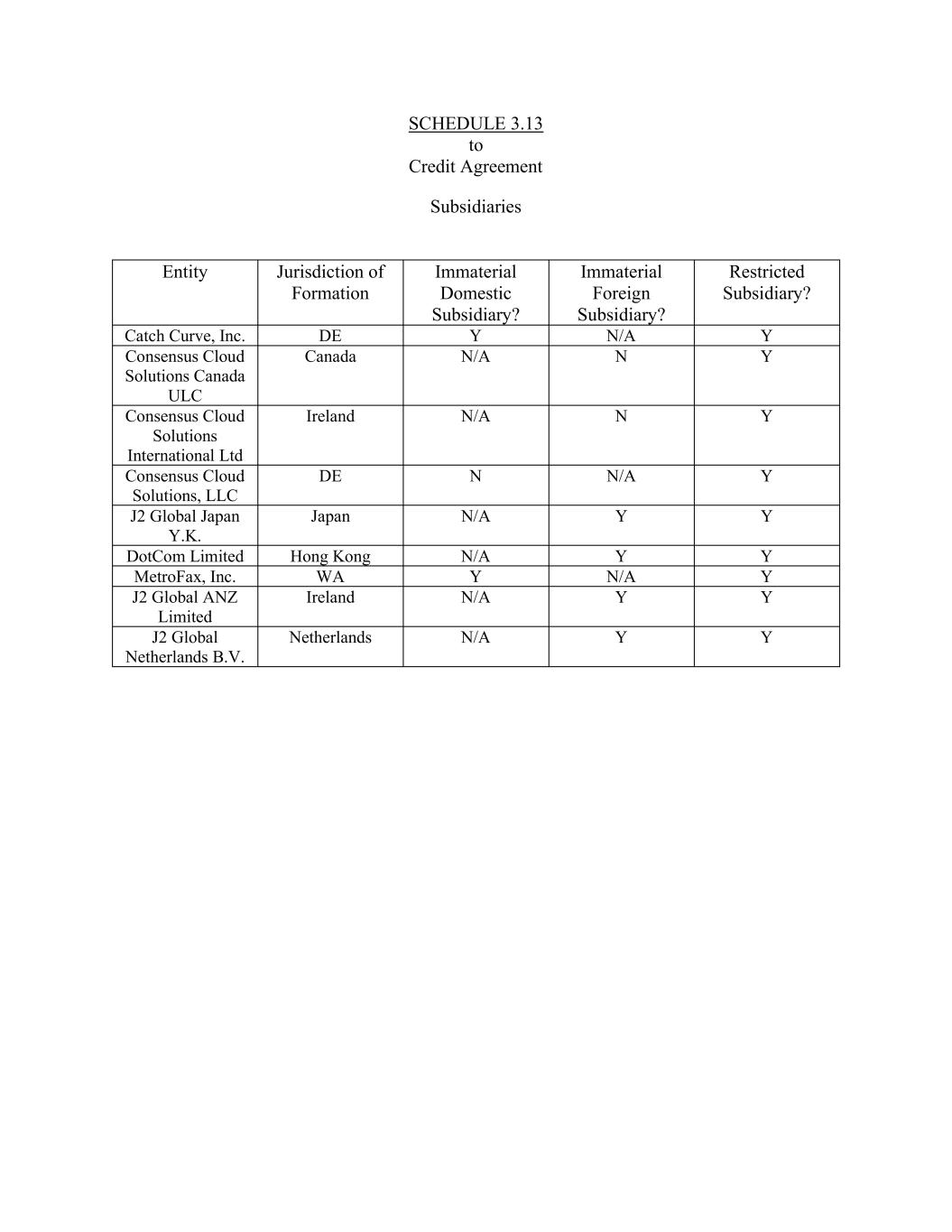 SCHEDULE 3.13 to Credit Agreement Subsidiaries Entity Jurisdiction of Formation Immaterial Domestic Subsidiary? Immaterial Foreign Subsidiary? Restricted Subsidiary? Catch Curve, Inc. DE Y N/A Y Consensus Cloud Solutions Canada ULC Canada N/A N Y Consensus Cloud Solutions International Ltd Ireland N/A N Y Consensus Cloud Solutions, LLC DE N N/A Y J2 Global Japan Y.K. Japan N/A Y Y DotCom Limited Hong Kong N/A Y Y MetroFax, Inc. WA Y N/A Y J2 Global ANZ Limited Ireland N/A Y Y J2 Global Netherlands B.V. Netherlands N/A Y Y