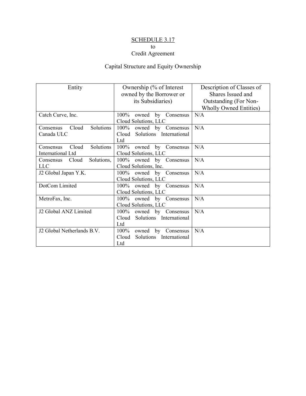 SCHEDULE 3.17 to Credit Agreement Capital Structure and Equity Ownership Entity Ownership (% of Interest owned by the Borrower or its Subsidiaries) Description of Classes of Shares Issued and Outstanding (For Non- Wholly Owned Entities) Catch Curve, Inc. 100% owned by Consensus Cloud Solutions, LLC N/A Consensus Cloud Solutions Canada ULC 100% owned by Consensus Cloud Solutions International Ltd N/A Consensus Cloud Solutions International Ltd 100% owned by Consensus Cloud Solutions, LLC N/A Consensus Cloud Solutions, LLC 100% owned by Consensus Cloud Solutions, Inc. N/A J2 Global Japan Y.K. 100% owned by Consensus Cloud Solutions, LLC N/A DotCom Limited 100% owned by Consensus Cloud Solutions, LLC N/A MetroFax, Inc. 100% owned by Consensus Cloud Solutions, LLC N/A J2 Global ANZ Limited 100% owned by Consensus Cloud Solutions International Ltd N/A J2 Global Netherlands B.V. 100% owned by Consensus Cloud Solutions International Ltd N/A