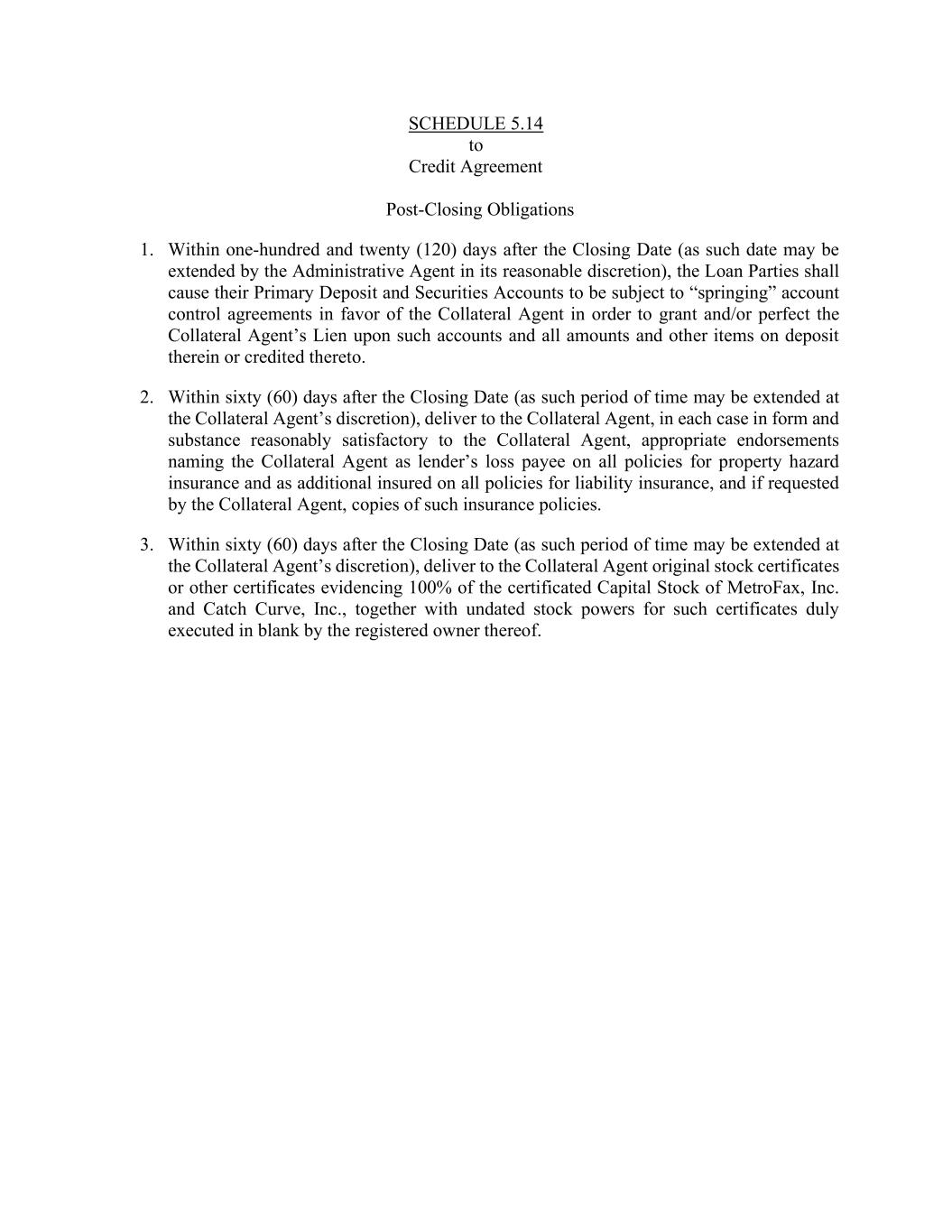 SCHEDULE 5.14 to Credit Agreement Post-Closing Obligations 1. Within one-hundred and twenty (120) days after the Closing Date (as such date may be extended by the Administrative Agent in its reasonable discretion), the Loan Parties shall cause their Primary Deposit and Securities Accounts to be subject to “springing” account control agreements in favor of the Collateral Agent in order to grant and/or perfect the Collateral Agent’s Lien upon such accounts and all amounts and other items on deposit therein or credited thereto. 2. Within sixty (60) days after the Closing Date (as such period of time may be extended at the Collateral Agent’s discretion), deliver to the Collateral Agent, in each case in form and substance reasonably satisfactory to the Collateral Agent, appropriate endorsements naming the Collateral Agent as lender’s loss payee on all policies for property hazard insurance and as additional insured on all policies for liability insurance, and if requested by the Collateral Agent, copies of such insurance policies. 3. Within sixty (60) days after the Closing Date (as such period of time may be extended at the Collateral Agent’s discretion), deliver to the Collateral Agent original stock certificates or other certificates evidencing 100% of the certificated Capital Stock of MetroFax, Inc. and Catch Curve, Inc., together with undated stock powers for such certificates duly executed in blank by the registered owner thereof.