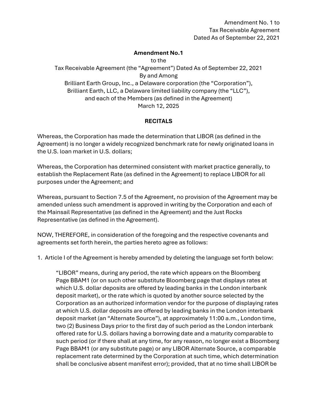 Amendment No. 1 to Tax Receivable Agreement Dated As of September 22, 2021 Amendment No.1 to the Tax Receivable Agreement (the “Agreement”) Dated As of September 22, 2021 By and Among Brilliant Earth Group, Inc., a Delaware corporation (the “Corporation”), Brilliant Earth, LLC, a Delaware limited liability company (the “LLC”), and each of the Members (as defined in the Agreement) March 12, 2025 RECITALS Whereas, the Corporation has made the determination that LIBOR (as defined in the Agreement) is no longer a widely recognized benchmark rate for newly originated loans in the U.S. loan market in U.S. dollars; Whereas, the Corporation has determined consistent with market practice generally, to establish the Replacement Rate (as defined in the Agreement) to replace LIBOR for all purposes under the Agreement; and Whereas, pursuant to Section 7.5 of the Agreement, no provision of the Agreement may be amended unless such amendment is approved in writing by the Corporation and each of the Mainsail Representative (as defined in the Agreement) and the Just Rocks Representative (as defined in the Agreement). NOW, THEREFORE, in consideration of the foregoing and the respective covenants and agreements set forth herein, the parties hereto agree as follows: 1. Article I of the Agreement is hereby amended by deleting the language set forth below: “LIBOR” means, during any period, the rate which appears on the Bloomberg Page BBAM1 (or on such other substitute Bloomberg page that displays rates at which U.S. dollar deposits are offered by leading banks in the London interbank deposit market), or the rate which is quoted by another source selected by the Corporation as an authorized information vendor for the purpose of displaying rates at which U.S. dollar deposits are offered by leading banks in the London interbank deposit market (an “Alternate Source”), at approximately 11:00 a.m., London time, two (2) Business Days prior to the first day of such period as the London interbank offered rate for U.S. dollars having a borrowing date and a maturity comparable to such period (or if there shall at any time, for any reason, no longer exist a Bloomberg Page BBAM1 (or any substitute page) or any LIBOR Alternate Source, a comparable replacement rate determined by the Corporation at such time, which determination shall be conclusive absent manifest error); provided, that at no time shall LIBOR be