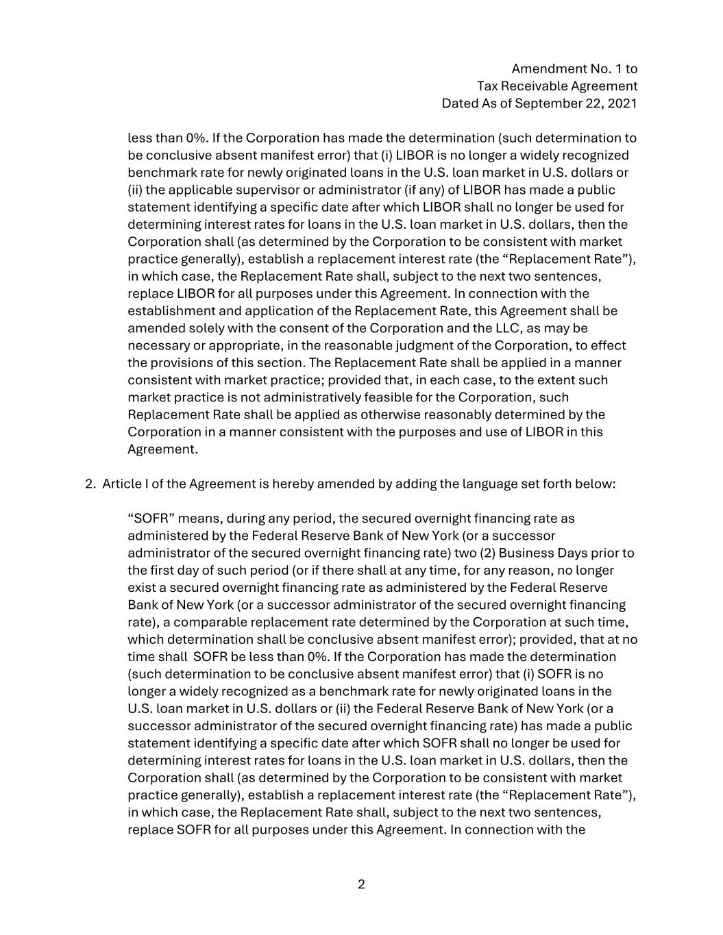 Amendment No. 1 to Tax Receivable Agreement Dated As of September 22, 2021 2 less than 0%. If the Corporation has made the determination (such determination to be conclusive absent manifest error) that (i) LIBOR is no longer a widely recognized benchmark rate for newly originated loans in the U.S. loan market in U.S. dollars or (ii) the applicable supervisor or administrator (if any) of LIBOR has made a public statement identifying a specific date after which LIBOR shall no longer be used for determining interest rates for loans in the U.S. loan market in U.S. dollars, then the Corporation shall (as determined by the Corporation to be consistent with market practice generally), establish a replacement interest rate (the “Replacement Rate”), in which case, the Replacement Rate shall, subject to the next two sentences, replace LIBOR for all purposes under this Agreement. In connection with the establishment and application of the Replacement Rate, this Agreement shall be amended solely with the consent of the Corporation and the LLC, as may be necessary or appropriate, in the reasonable judgment of the Corporation, to effect the provisions of this section. The Replacement Rate shall be applied in a manner consistent with market practice; provided that, in each case, to the extent such market practice is not administratively feasible for the Corporation, such Replacement Rate shall be applied as otherwise reasonably determined by the Corporation in a manner consistent with the purposes and use of LIBOR in this Agreement. 2. Article I of the Agreement is hereby amended by adding the language set forth below: “SOFR” means, during any period, the secured overnight financing rate as administered by the Federal Reserve Bank of New York (or a successor administrator of the secured overnight financing rate) two (2) Business Days prior to the first day of such period (or if there shall at any time, for any reason, no longer exist a secured overnight financing rate as administered by the Federal Reserve Bank of New York (or a successor administrator of the secured overnight financing rate), a comparable replacement rate determined by the Corporation at such time, which determination shall be conclusive absent manifest error); provided, that at no time shall SOFR be less than 0%. If the Corporation has made the determination (such determination to be conclusive absent manifest error) that (i) SOFR is no longer a widely recognized as a benchmark rate for newly originated loans in the U.S. loan market in U.S. dollars or (ii) the Federal Reserve Bank of New York (or a successor administrator of the secured overnight financing rate) has made a public statement identifying a specific date after which SOFR shall no longer be used for determining interest rates for loans in the U.S. loan market in U.S. dollars, then the Corporation shall (as determined by the Corporation to be consistent with market practice generally), establish a replacement interest rate (the “Replacement Rate”), in which case, the Replacement Rate shall, subject to the next two sentences, replace SOFR for all purposes under this Agreement. In connection with the