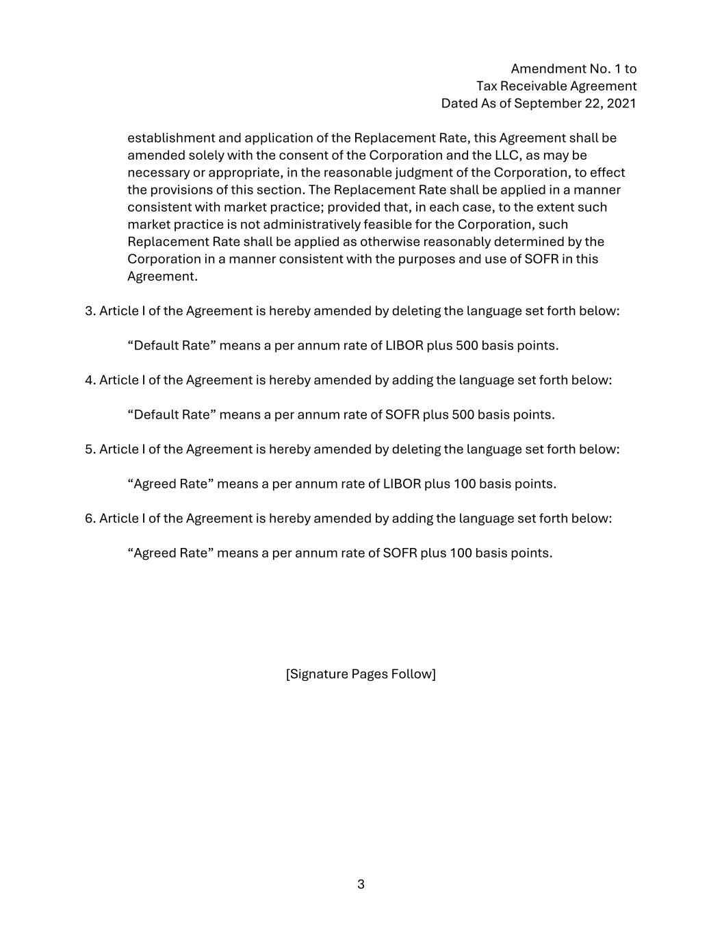 Amendment No. 1 to Tax Receivable Agreement Dated As of September 22, 2021 3 establishment and application of the Replacement Rate, this Agreement shall be amended solely with the consent of the Corporation and the LLC, as may be necessary or appropriate, in the reasonable judgment of the Corporation, to effect the provisions of this section. The Replacement Rate shall be applied in a manner consistent with market practice; provided that, in each case, to the extent such market practice is not administratively feasible for the Corporation, such Replacement Rate shall be applied as otherwise reasonably determined by the Corporation in a manner consistent with the purposes and use of SOFR in this Agreement. 3. Article I of the Agreement is hereby amended by deleting the language set forth below: “Default Rate” means a per annum rate of LIBOR plus 500 basis points. 4. Article I of the Agreement is hereby amended by adding the language set forth below: “Default Rate” means a per annum rate of SOFR plus 500 basis points. 5. Article I of the Agreement is hereby amended by deleting the language set forth below: “Agreed Rate” means a per annum rate of LIBOR plus 100 basis points. 6. Article I of the Agreement is hereby amended by adding the language set forth below: “Agreed Rate” means a per annum rate of SOFR plus 100 basis points. [Signature Pages Follow]