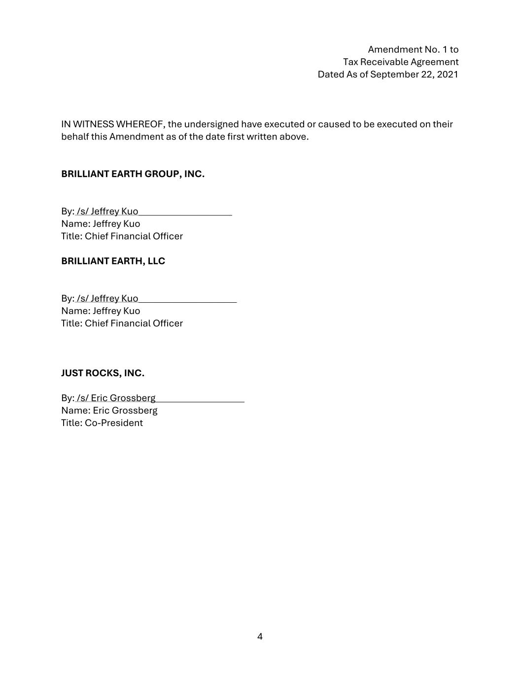 Amendment No. 1 to Tax Receivable Agreement Dated As of September 22, 2021 4 IN WITNESS WHEREOF, the undersigned have executed or caused to be executed on their behalf this Amendment as of the date first written above. BRILLIANT EARTH GROUP, INC. By: /s/ Jeffrey Kuo____________________ Name: Jeffrey Kuo Title: Chief Financial Officer BRILLIANT EARTH, LLC By: /s/ Jeffrey Kuo_____________________ Name: Jeffrey Kuo Title: Chief Financial Officer JUST ROCKS, INC. By: /s/ Eric Grossberg___________________ Name: Eric Grossberg Title: Co-President