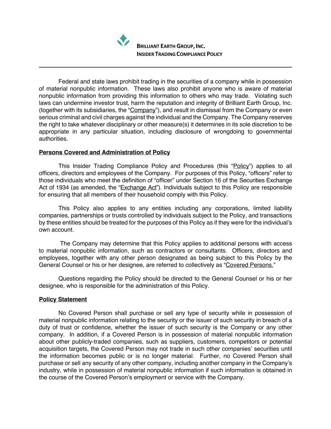 BRILLIANT EARTH GROUP, INC. INSIDER TRADING COMPLIANCE POLICY Federal and state laws prohibit trading in the securities of a company while in possession of material nonpublic information. These laws also prohibit anyone who is aware of material nonpublic information from providing this information to others who may trade. Violating such laws can undermine investor trust, harm the reputation and integrity of Brilliant Earth Group, Inc. (together with its subsidiaries, the “Company”), and result in dismissal from the Company or even serious criminal and civil charges against the individual and the Company. The Company reserves the right to take whatever disciplinary or other measure(s) it determines in its sole discretion to be appropriate in any particular situation, including disclosure of wrongdoing to governmental authorities. Persons Covered and Administration of Policy This Insider Trading Compliance Policy and Procedures (this “Policy”) applies to all officers, directors and employees of the Company. For purposes of this Policy, “officers” refer to those individuals who meet the definition of “officer” under Section 16 of the Securities Exchange Act of 1934 (as amended, the “Exchange Act”). Individuals subject to this Policy are responsible for ensuring that all members of their household comply with this Policy. This Policy also applies to any entities including any corporations, limited liability companies, partnerships or trusts controlled by individuals subject to the Policy, and transactions by these entities should be treated for the purposes of this Policy as if they were for the individual’s own account. The Company may determine that this Policy applies to additional persons with access to material nonpublic information, such as contractors or consultants. Officers, directors and employees, together with any other person designated as being subject to this Policy by the General Counsel or his or her designee, are referred to collectively as “Covered Persons.” Questions regarding the Policy should be directed to the General Counsel or his or her designee, who is responsible for the administration of this Policy. Policy Statement No Covered Person shall purchase or sell any type of security while in possession of material nonpublic information relating to the security or the issuer of such security in breach of a duty of trust or confidence, whether the issuer of such security is the Company or any other company. In addition, if a Covered Person is in possession of material nonpublic information about other publicly-traded companies, such as suppliers, customers, competitors or potential acquisition targets, the Covered Person may not trade in such other companies’ securities until the information becomes public or is no longer material. Further, no Covered Person shall purchase or sell any security of any other company, including another company in the Company’s industry, while in possession of material nonpublic information if such information is obtained in the course of the Covered Person’s employment or service with the Company.