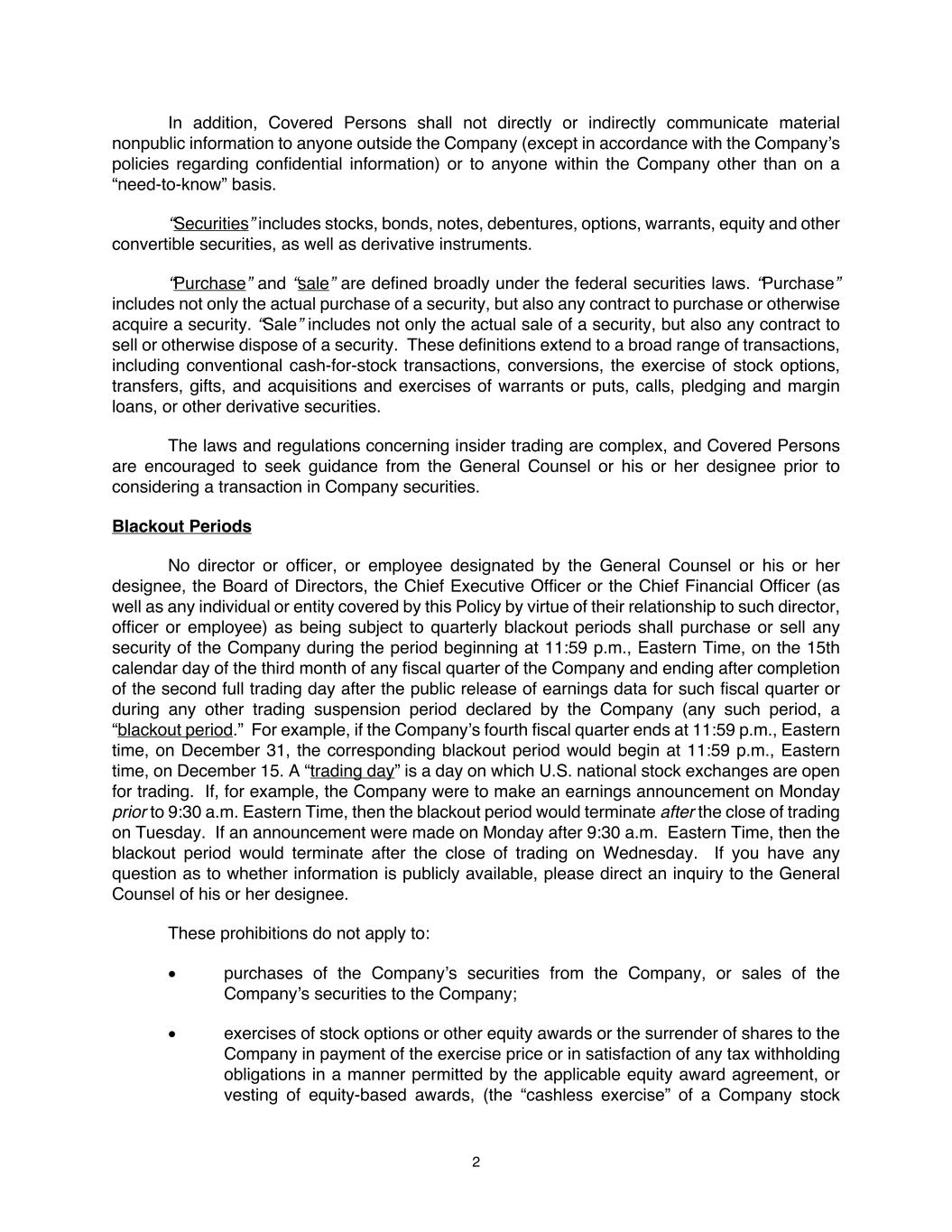 2 In addition, Covered Persons shall not directly or indirectly communicate material nonpublic information to anyone outside the Company (except in accordance with the Company’s policies regarding confidential information) or to anyone within the Company other than on a “need-to-know” basis. “Securities” includes stocks, bonds, notes, debentures, options, warrants, equity and other convertible securities, as well as derivative instruments. “Purchase” and “sale” are defined broadly under the federal securities laws. “Purchase” includes not only the actual purchase of a security, but also any contract to purchase or otherwise acquire a security. “Sale” includes not only the actual sale of a security, but also any contract to sell or otherwise dispose of a security. These definitions extend to a broad range of transactions, including conventional cash-for-stock transactions, conversions, the exercise of stock options, transfers, gifts, and acquisitions and exercises of warrants or puts, calls, pledging and margin loans, or other derivative securities. The laws and regulations concerning insider trading are complex, and Covered Persons are encouraged to seek guidance from the General Counsel or his or her designee prior to considering a transaction in Company securities. Blackout Periods No director or officer, or employee designated by the General Counsel or his or her designee, the Board of Directors, the Chief Executive Officer or the Chief Financial Officer (as well as any individual or entity covered by this Policy by virtue of their relationship to such director, officer or employee) as being subject to quarterly blackout periods shall purchase or sell any security of the Company during the period beginning at 11:59 p.m., Eastern Time, on the 15th calendar day of the third month of any fiscal quarter of the Company and ending after completion of the second full trading day after the public release of earnings data for such fiscal quarter or during any other trading suspension period declared by the Company (any such period, a “blackout period.” For example, if the Company’s fourth fiscal quarter ends at 11:59 p.m., Eastern time, on December 31, the corresponding blackout period would begin at 11:59 p.m., Eastern time, on December 15. A “trading day” is a day on which U.S. national stock exchanges are open for trading. If, for example, the Company were to make an earnings announcement on Monday prior to 9:30 a.m. Eastern Time, then the blackout period would terminate after the close of trading on Tuesday. If an announcement were made on Monday after 9:30 a.m. Eastern Time, then the blackout period would terminate after the close of trading on Wednesday. If you have any question as to whether information is publicly available, please direct an inquiry to the General Counsel of his or her designee. These prohibitions do not apply to: • purchases of the Company’s securities from the Company, or sales of the Company’s securities to the Company; • exercises of stock options or other equity awards or the surrender of shares to the Company in payment of the exercise price or in satisfaction of any tax withholding obligations in a manner permitted by the applicable equity award agreement, or vesting of equity-based awards, (the “cashless exercise” of a Company stock