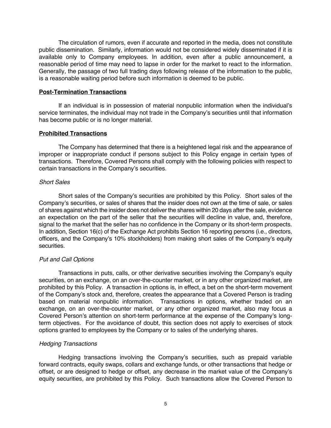 5 The circulation of rumors, even if accurate and reported in the media, does not constitute public dissemination. Similarly, information would not be considered widely disseminated if it is available only to Company employees. In addition, even after a public announcement, a reasonable period of time may need to lapse in order for the market to react to the information. Generally, the passage of two full trading days following release of the information to the public, is a reasonable waiting period before such information is deemed to be public. Post-Termination Transactions If an individual is in possession of material nonpublic information when the individual’s service terminates, the individual may not trade in the Company’s securities until that information has become public or is no longer material. Prohibited Transactions The Company has determined that there is a heightened legal risk and the appearance of improper or inappropriate conduct if persons subject to this Policy engage in certain types of transactions. Therefore, Covered Persons shall comply with the following policies with respect to certain transactions in the Company’s securities. Short Sales Short sales of the Company’s securities are prohibited by this Policy. Short sales of the Company’s securities, or sales of shares that the insider does not own at the time of sale, or sales of shares against which the insider does not deliver the shares within 20 days after the sale, evidence an expectation on the part of the seller that the securities will decline in value, and, therefore, signal to the market that the seller has no confidence in the Company or its short-term prospects. In addition, Section 16(c) of the Exchange Act prohibits Section 16 reporting persons (i.e., directors, officers, and the Company’s 10% stockholders) from making short sales of the Company’s equity securities. Put and Call Options Transactions in puts, calls, or other derivative securities involving the Company’s equity securities, on an exchange, on an over-the-counter market, or in any other organized market, are prohibited by this Policy. A transaction in options is, in effect, a bet on the short-term movement of the Company’s stock and, therefore, creates the appearance that a Covered Person is trading based on material nonpublic information. Transactions in options, whether traded on an exchange, on an over-the-counter market, or any other organized market, also may focus a Covered Person’s attention on short-term performance at the expense of the Company’s long- term objectives. For the avoidance of doubt, this section does not apply to exercises of stock options granted to employees by the Company or to sales of the underlying shares. Hedging Transactions Hedging transactions involving the Company’s securities, such as prepaid variable forward contracts, equity swaps, collars and exchange funds, or other transactions that hedge or offset, or are designed to hedge or offset, any decrease in the market value of the Company’s equity securities, are prohibited by this Policy. Such transactions allow the Covered Person to