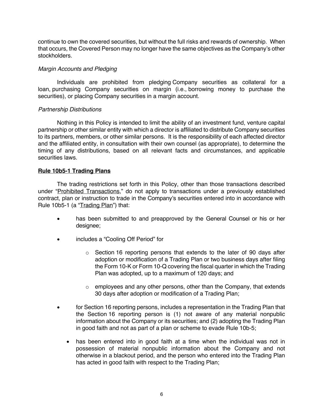 6 continue to own the covered securities, but without the full risks and rewards of ownership. When that occurs, the Covered Person may no longer have the same objectives as the Company’s other stockholders. Margin Accounts and Pledging Individuals are prohibited from pledging Company securities as collateral for a loan, purchasing Company securities on margin (i.e., borrowing money to purchase the securities), or placing Company securities in a margin account. Partnership Distributions Nothing in this Policy is intended to limit the ability of an investment fund, venture capital partnership or other similar entity with which a director is affiliated to distribute Company securities to its partners, members, or other similar persons. It is the responsibility of each affected director and the affiliated entity, in consultation with their own counsel (as appropriate), to determine the timing of any distributions, based on all relevant facts and circumstances, and applicable securities laws. Rule 10b5-1 Trading Plans The trading restrictions set forth in this Policy, other than those transactions described under “Prohibited Transactions,” do not apply to transactions under a previously established contract, plan or instruction to trade in the Company’s securities entered into in accordance with Rule 10b5-1 (a “Trading Plan”) that: • has been submitted to and preapproved by the General Counsel or his or her designee; • includes a “Cooling Off Period” for o Section 16 reporting persons that extends to the later of 90 days after adoption or modification of a Trading Plan or two business days after filing the Form 10-K or Form 10-Q covering the fiscal quarter in which the Trading Plan was adopted, up to a maximum of 120 days; and o employees and any other persons, other than the Company, that extends 30 days after adoption or modification of a Trading Plan; • for Section 16 reporting persons, includes a representation in the Trading Plan that the Section 16 reporting person is (1) not aware of any material nonpublic information about the Company or its securities; and (2) adopting the Trading Plan in good faith and not as part of a plan or scheme to evade Rule 10b-5; • has been entered into in good faith at a time when the individual was not in possession of material nonpublic information about the Company and not otherwise in a blackout period, and the person who entered into the Trading Plan has acted in good faith with respect to the Trading Plan;